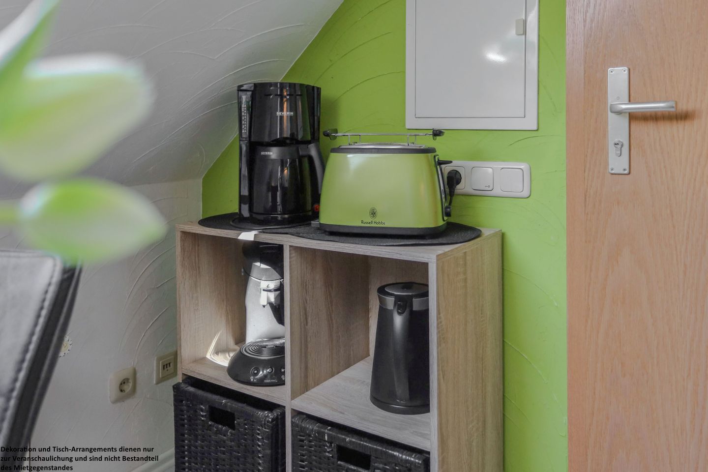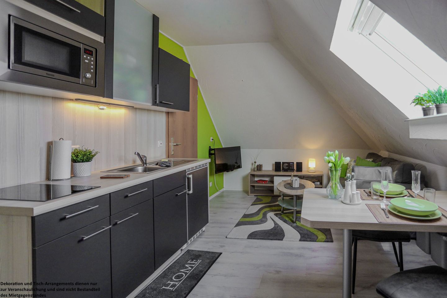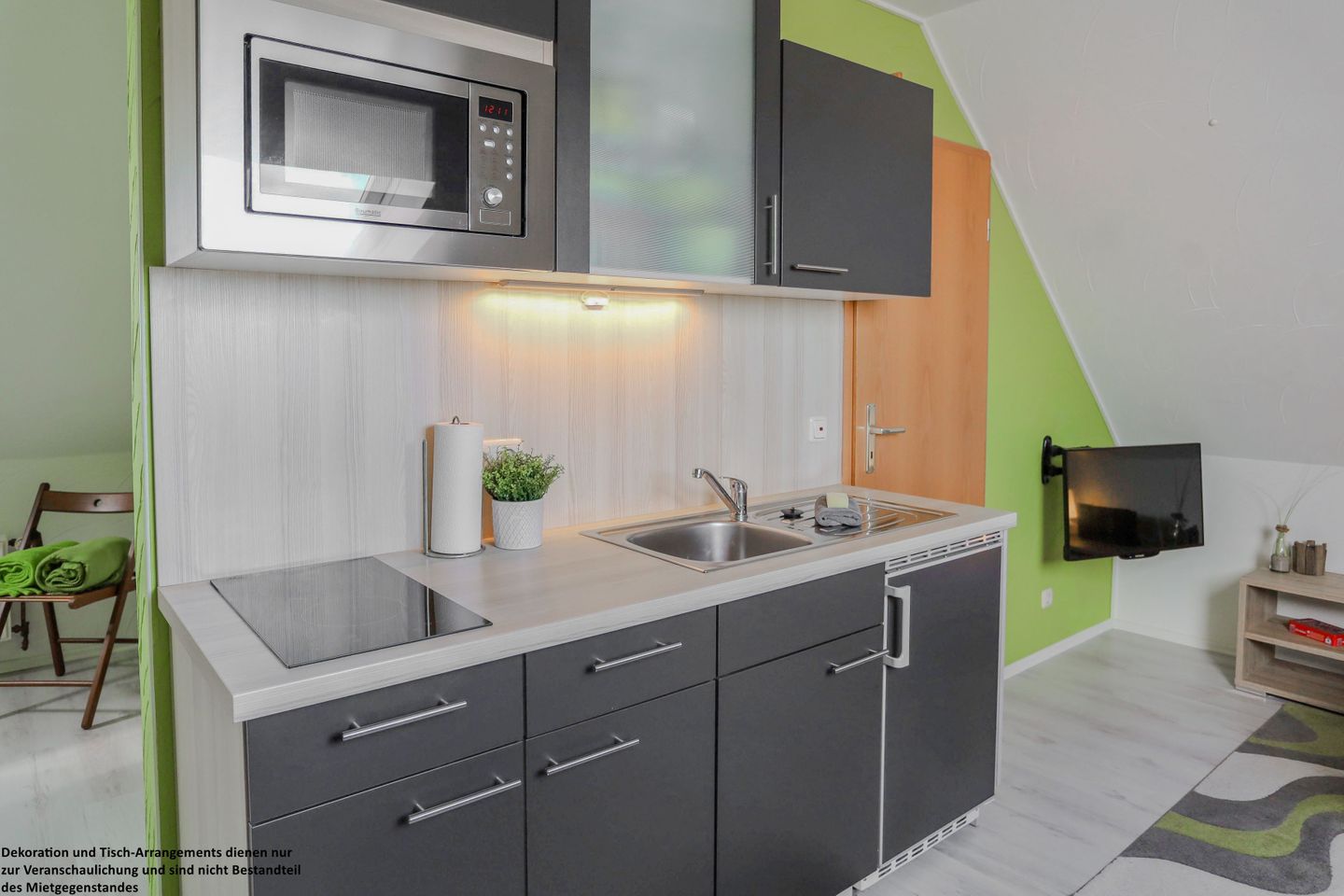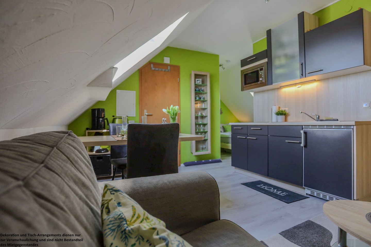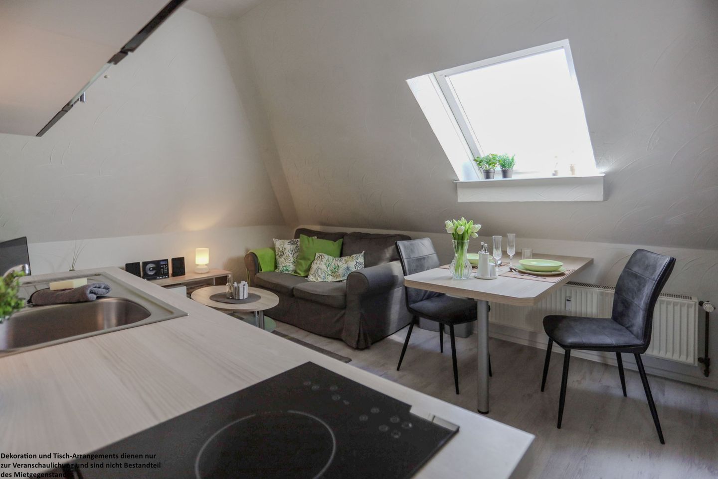 Die angrenzende, kompakte Küche ist praktisch und vollständig ausgestattet – ideal für Ihre Selbstversorgung, vom schnellen Frühstück bis zum gemütlichen Abendessen. Direkt daneben befindet sich der einladende Essplatz, der nicht nur zum gemeinsamen Essen, sondern auch zum Lesen eines guten Buches oder für stille Momente einlädt.