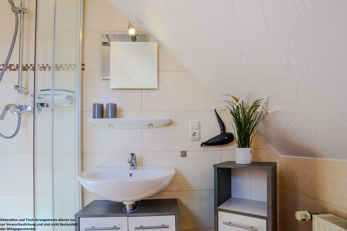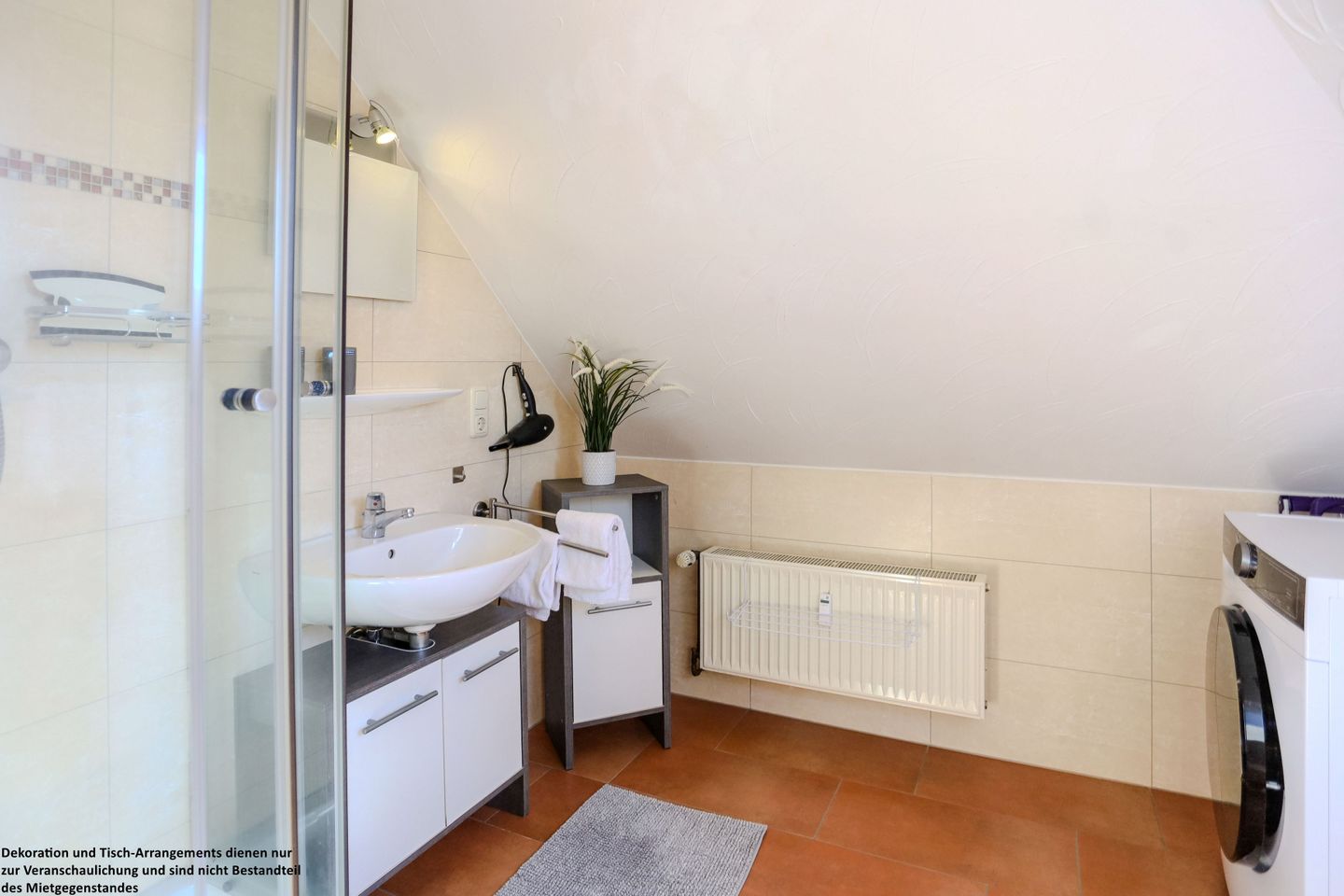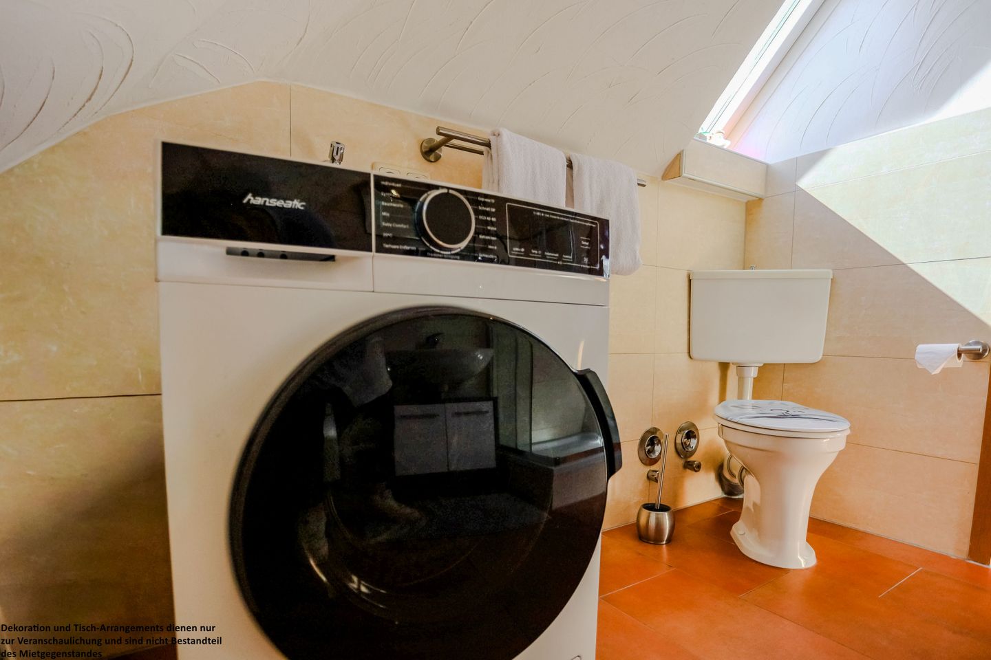 Das hell geflieste Badezimmer mit Dusche und eigenem Dachfenster sorgt für einen frischen, angenehmen Start in den Tag. Für zusätzlichen Komfort steht Ihnen außerdem eine Waschmaschine zur Verfügung – ideal auch für längere Aufenthalte.