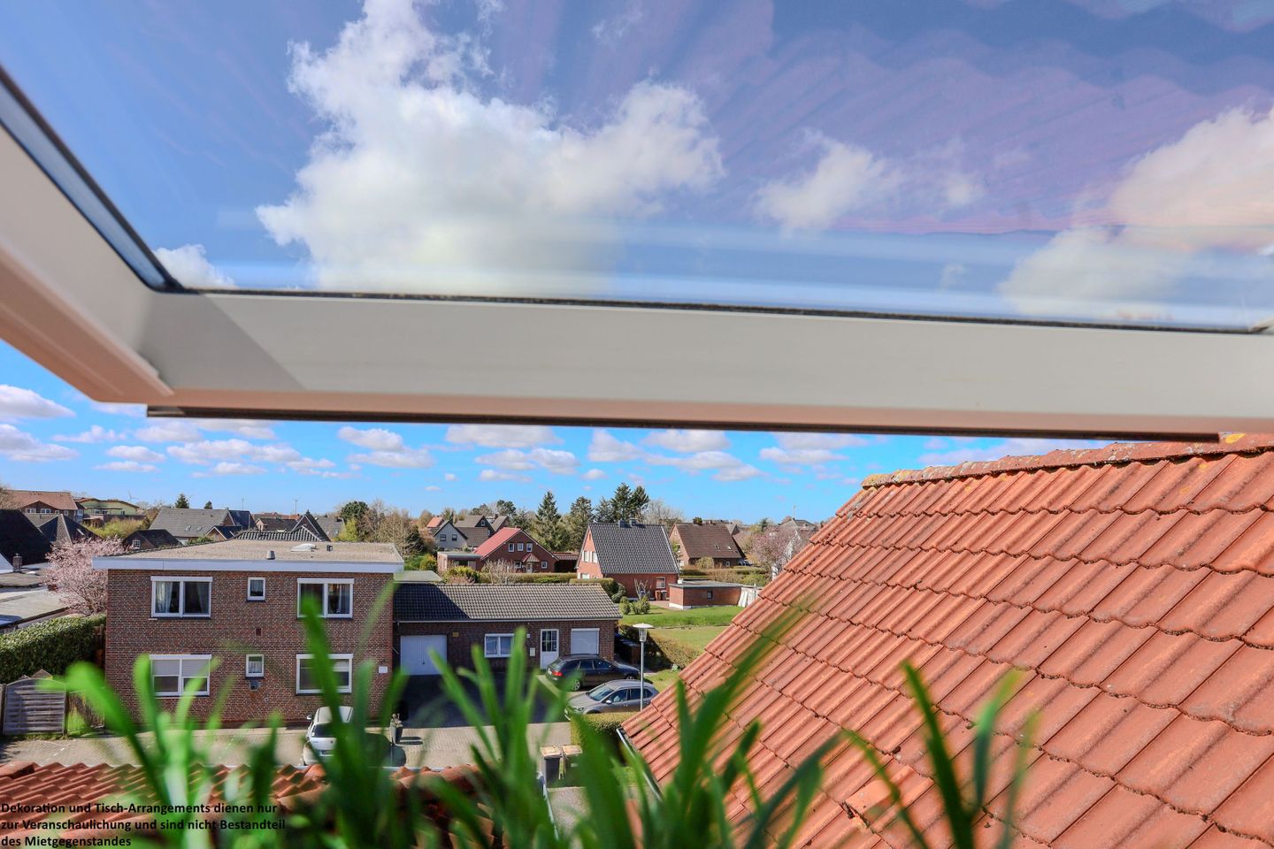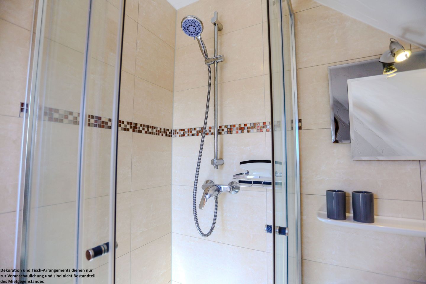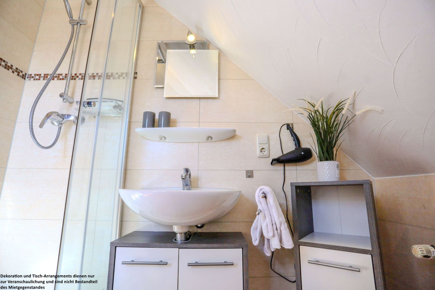 Das hell geflieste Badezimmer mit Dusche und eigenem Dachfenster sorgt für einen frischen, angenehmen Start in den Tag. Für zusätzlichen Komfort steht Ihnen außerdem eine Waschmaschine zur Verfügung – ideal auch für längere Aufenthalte.