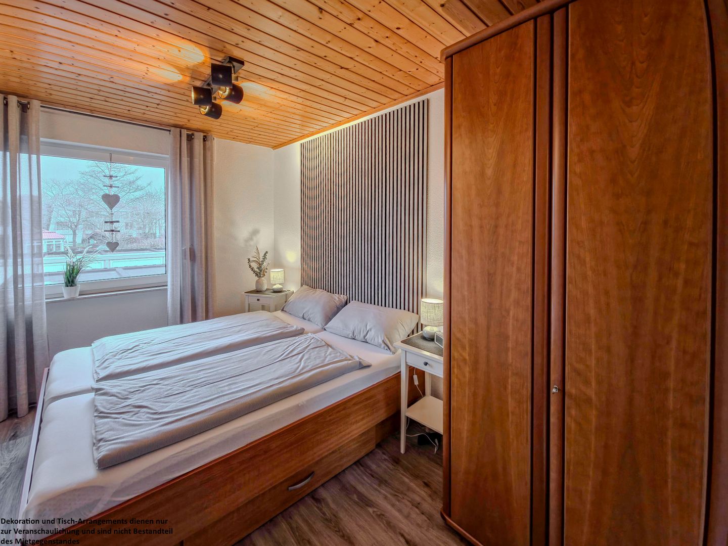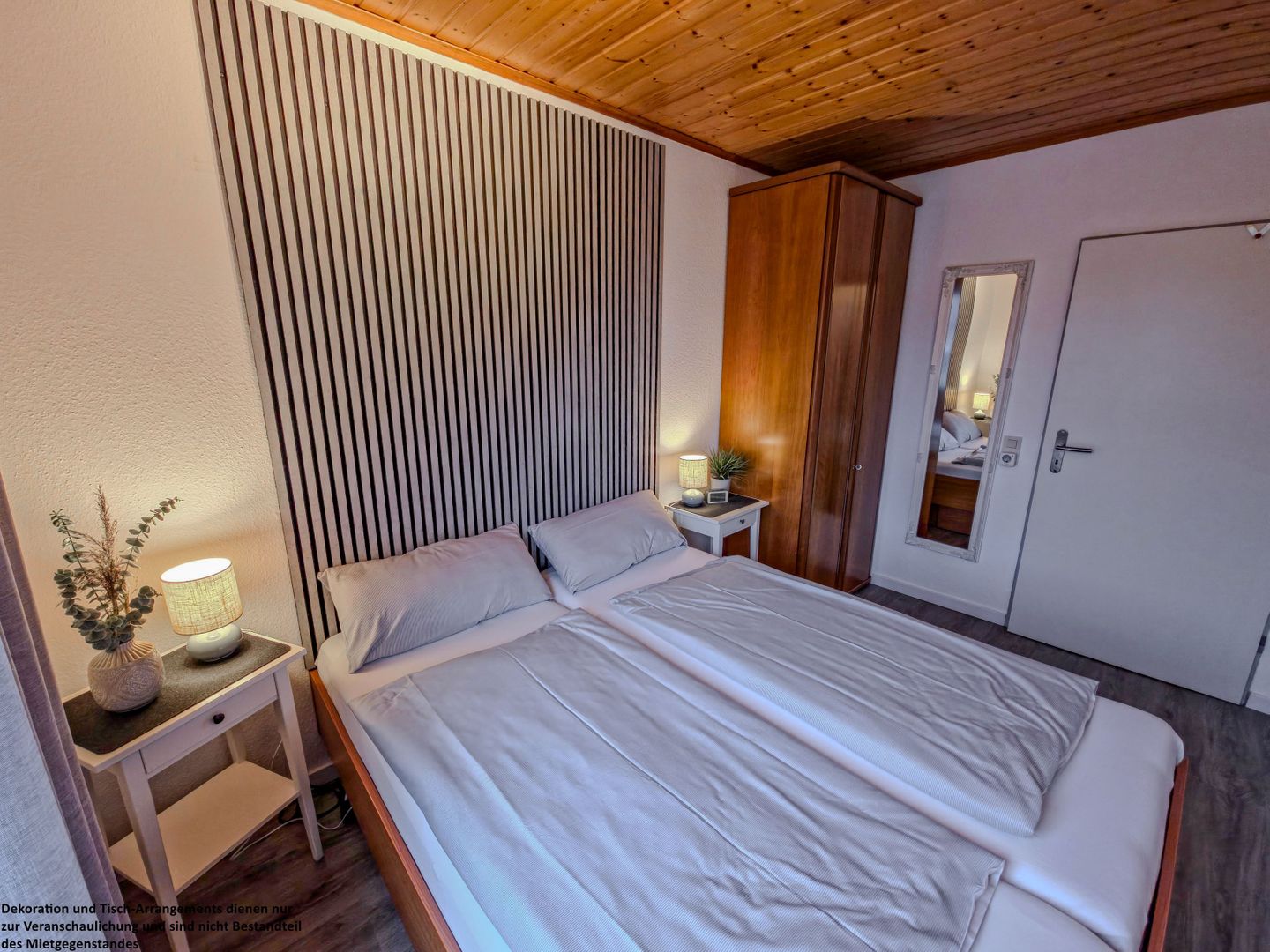 Das erste Schlafzimmer ist mit einem bequemen Doppelbett und einem großzügigen Kleiderschrank ausgestattet.