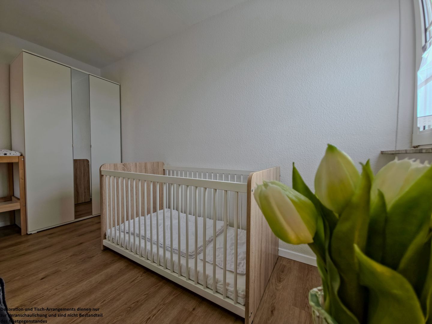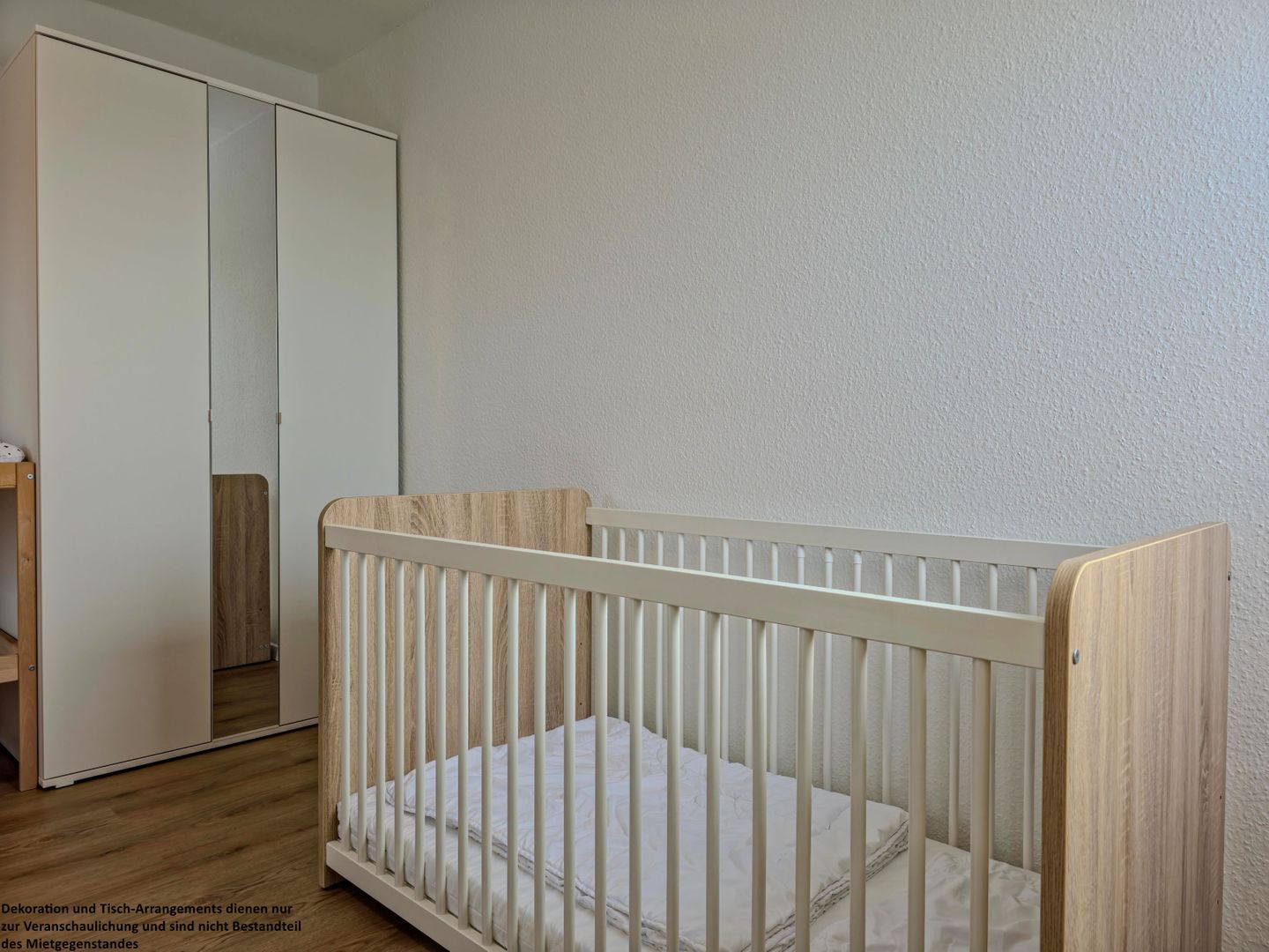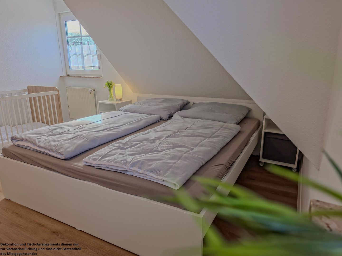 Im großen Schlafzimmer erwartet Sie ein 180 x 200 cm großes Bett mit einzelnen Matratzen für erholsamen Schlaf. Ein Holzbabybett steht für die Kleinsten bereit, während ein geräumiger Kleiderschrank genügend Stauraum bietet.