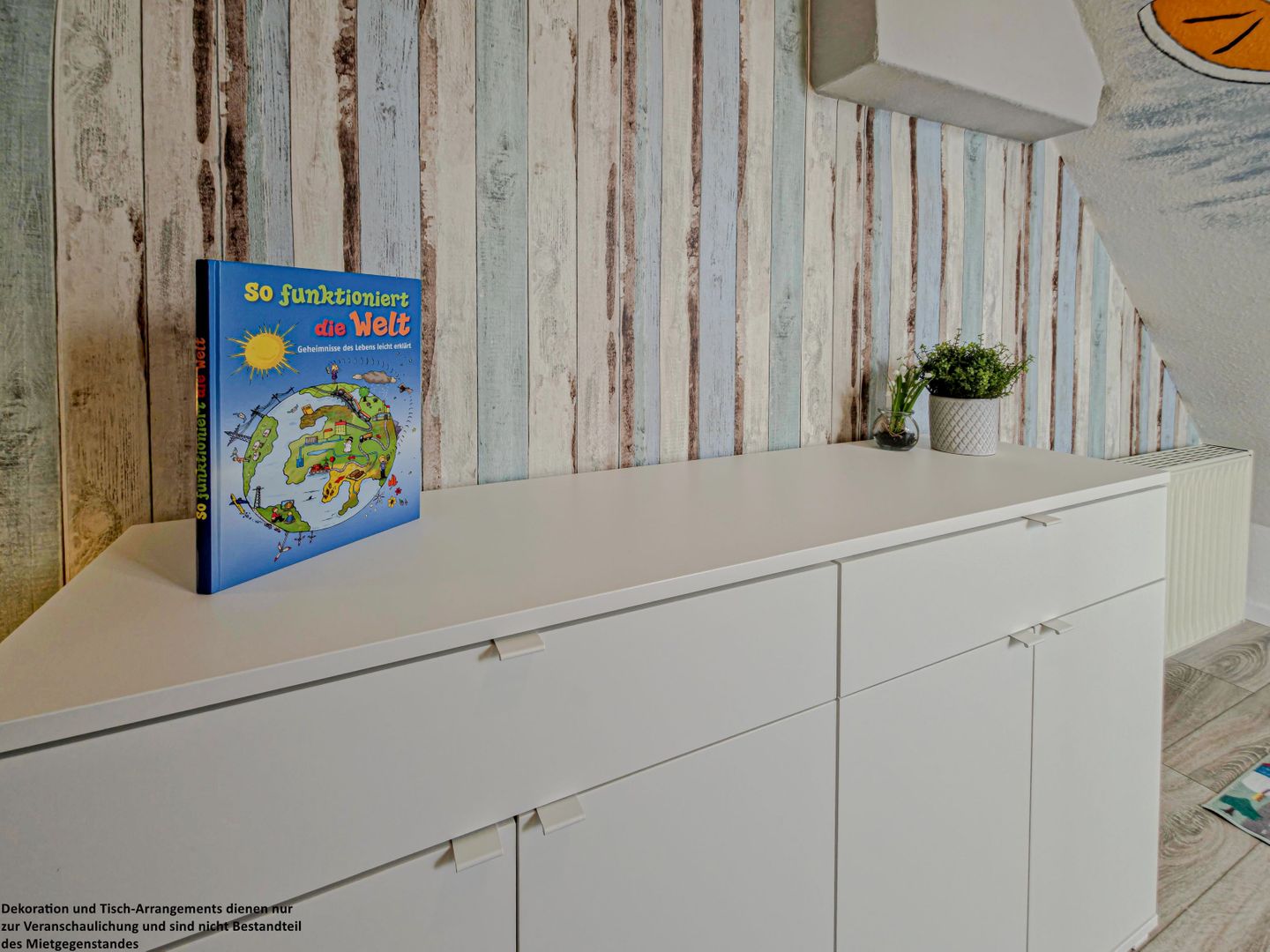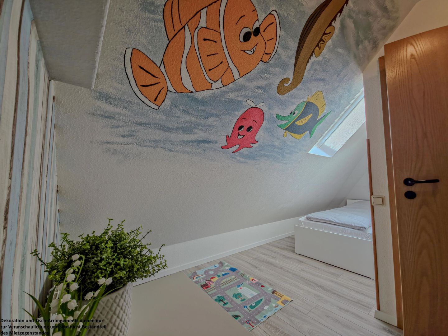 Im zweiten Schlafzimmer beginnt ein kleiner Traum für die Kinder: Liebevoll gestaltete Wände mit bunten Malereien, ein freundlicher Nemo, der über die Kleinen wacht, zwei Einzelbetten (90 x 200 cm), Dachfenster und behagliche Schräge schaffen eine geborgene Atmosphäre, in der die Kleinen sich rundum wohlfühlen.
