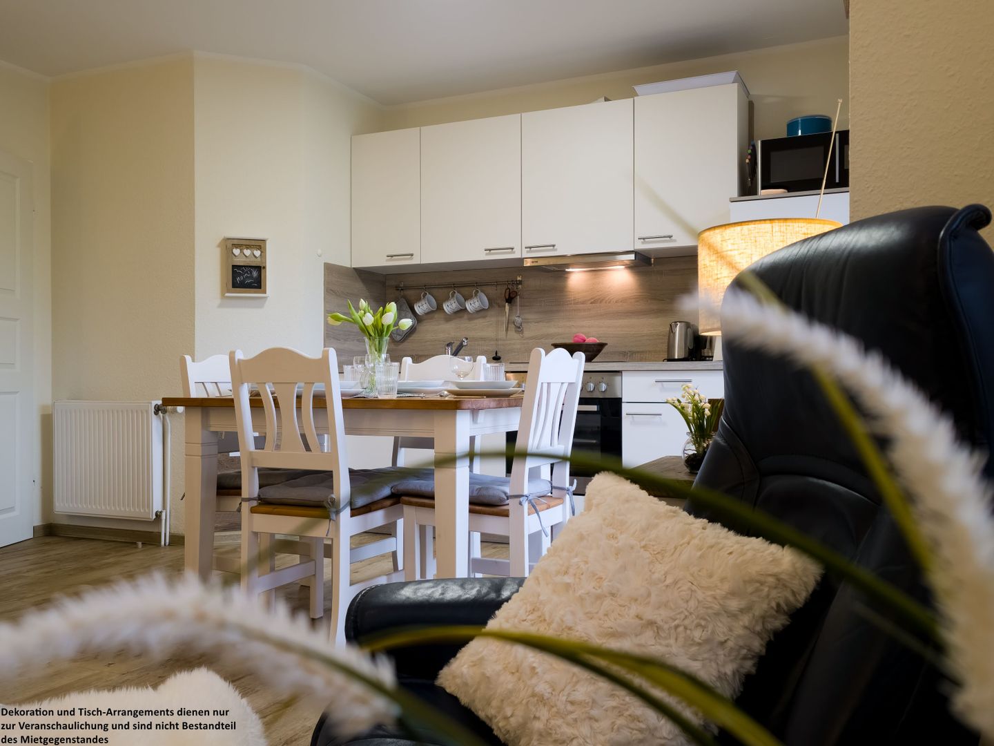 Das offene, lichtdurchflutete Wohnzimmer bietet mit seiner großen Fensterfront einen traumhaften Blick in den Garten. Vom gemütlichen Schlafsofa oder den Sesseln aus können Sie diesen Ausblick in vollen Zügen genießen. Die angrenzende Sitzgruppe lädt zu gemeinsamen Mahlzeiten, lustigen Spieleabenden oder einfach entspannten Gesprächen ein. Die in den Wohnbereich integrierte Küche ist modern und voll ausgestattet – ideal für Selbstversorger. Warme und helle Farbtöne schaffen auch hier eine angenehme Atmosphäre.