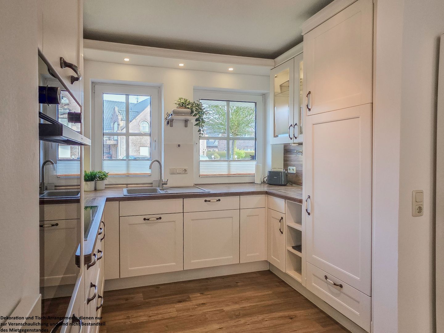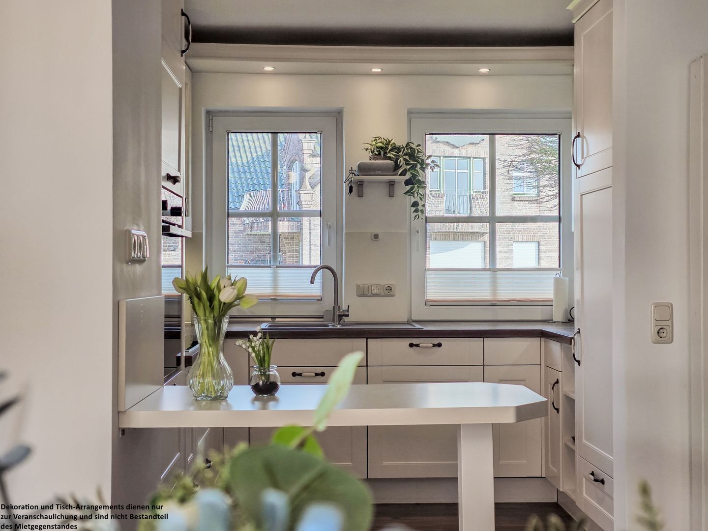 Die helle Landhausküche ist voll ausgestattet und ermöglicht Ihnen, kulinarische Köstlichkeiten selbst zuzubereiten. Dank des kleinen Tresens können Sie während des Kochens entspannt einen Kaffee genießen oder den Abend mit einem Glas Wein einläuten, während das Leben im Raum pulsiert.