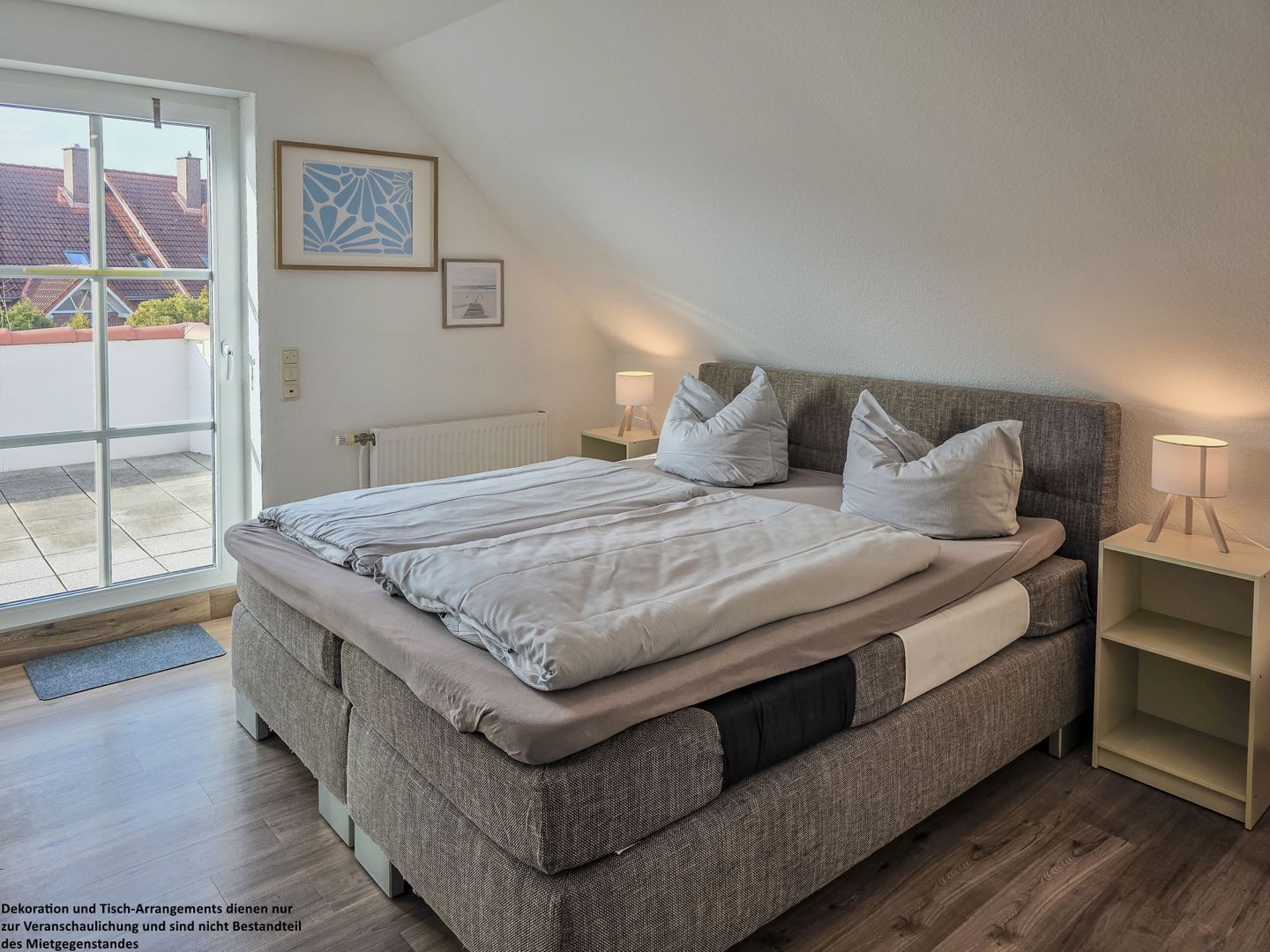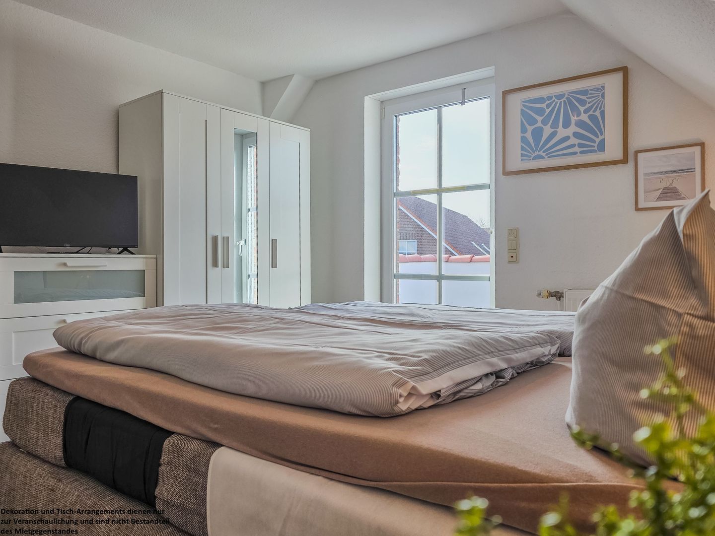 Das erste Schlafzimmer verfügt über ein Boxspringbett (180×200 cm), TV und Kleiderschrank.
