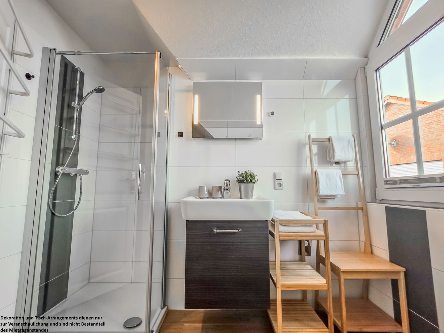 Das Badezimmer ist hell gefliest, modern in Grau akzentuiert und bietet sowohl Badewanne als auch Dusche sowie praktische Ablageflächen für Ihre persönlichen Dinge.