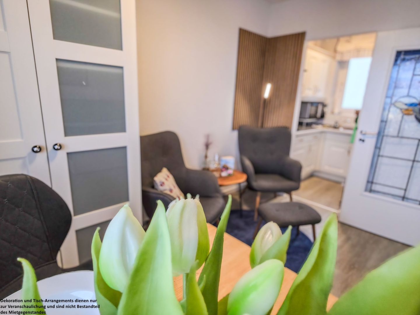Nachts verwandelt sich der Wohnbereich in einen gemütlichen Schlafplatz: Das praktische Schrankbett bietet Komfort und verschwindet tagsüber dezent, sodass Ihnen der Raum vollständig zur Verfügung steht. Ein Tresen mit zwei Stühlen lädt zu einem gemütlichen Frühstück ein, während zwei bequeme Sessel zum Verweilen und Fernsehen einladen.