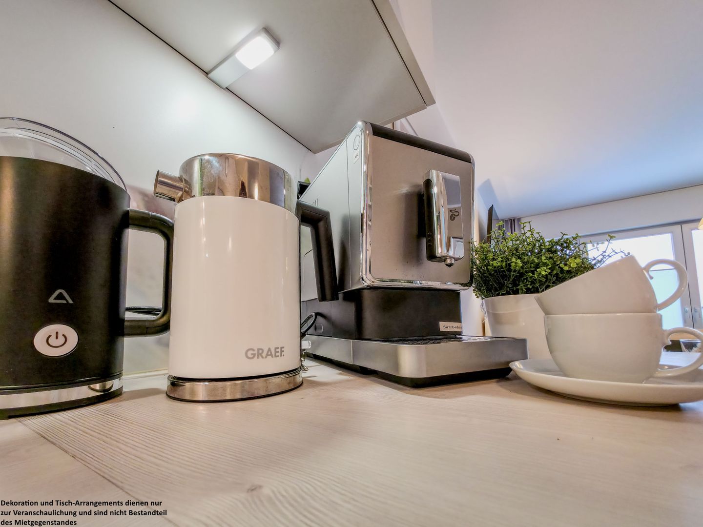 Die gemütliche Wohnzimmerecke mit bequemem Sofa und zwei Sesseln lädt zu entspannten Stunden vor dem Fernseher ein – oder genießen Sie den Blick auf den Balkon und das weite Meer. Der angrenzende Essbereich bietet genug Raum für gemeinsame Mahlzeiten, während die offene, helle Küche alles bereitstellt, was Sie für Ihre Selbstversorgung benötigen. Eine Spülmaschine erleichtert die Küchenarbeit, das Gefrierfach bietet Platz für ein erfrischendes Eis, und die Espressomaschine sorgt für einen perfekt zubereiteten Espresso am Morgen.