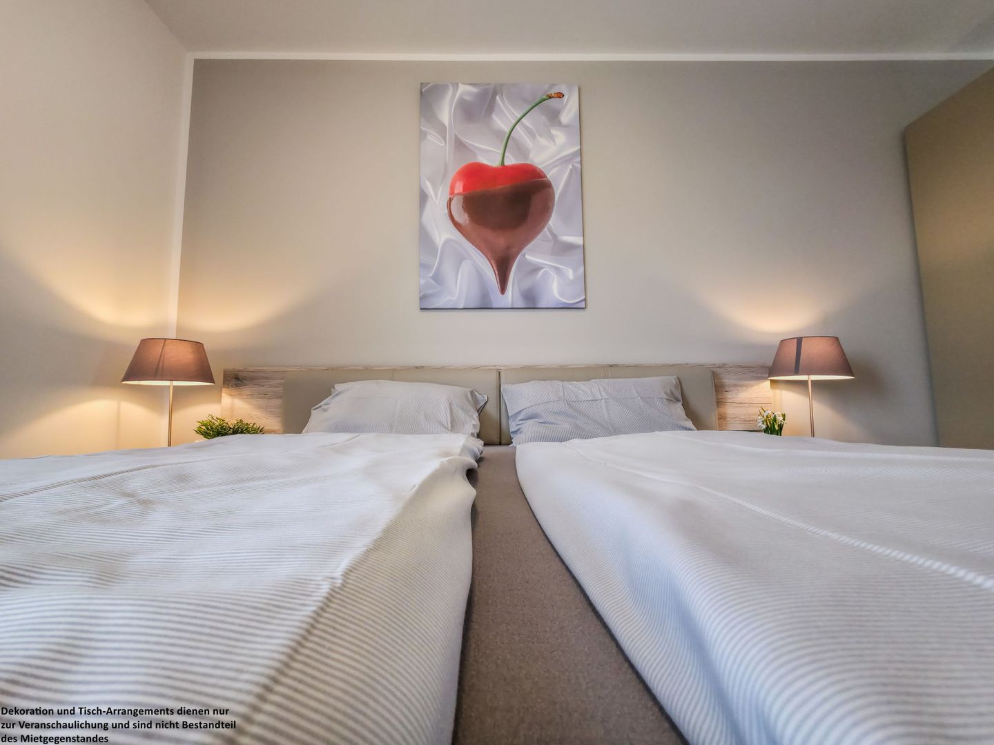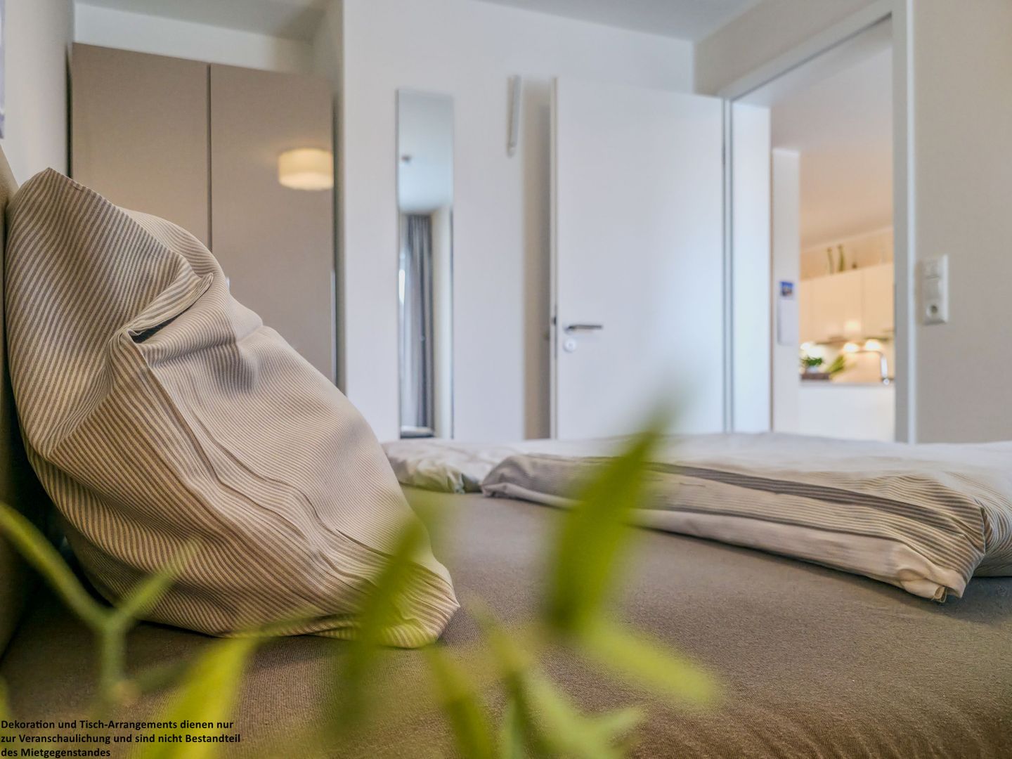 Das Herzstück der Wohnung ist der überdachte Balkon: Genießen Sie den weiten Ausblick, lassen Sie sich im Strandkorb nieder und spüren Sie den lauen Wind auf Ihrer Haut, während Sie den Tag bei einem Glas Wein ausklingen lassen. Alle Räume sind verdunkelbar, sodass Sie Ruhe und Erholung in vollen Zügen genießen können.