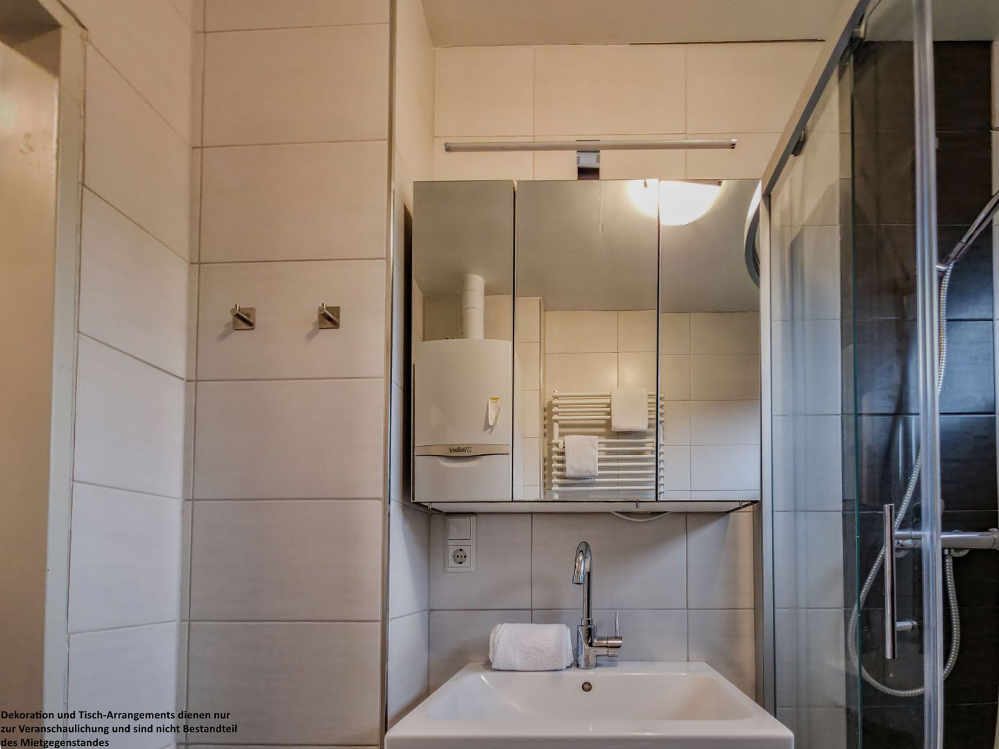Das helle, tageslichtdurchflutete Badezimmer, das Sie ebenfalls über den Flur erreichen, ist freundlich gefliest und verfügt über eine Duschwanne sowie einen Spiegelschrank mit ausreichend Stauraum.