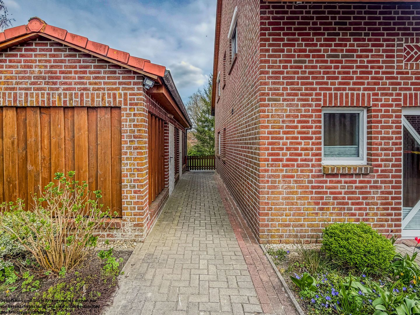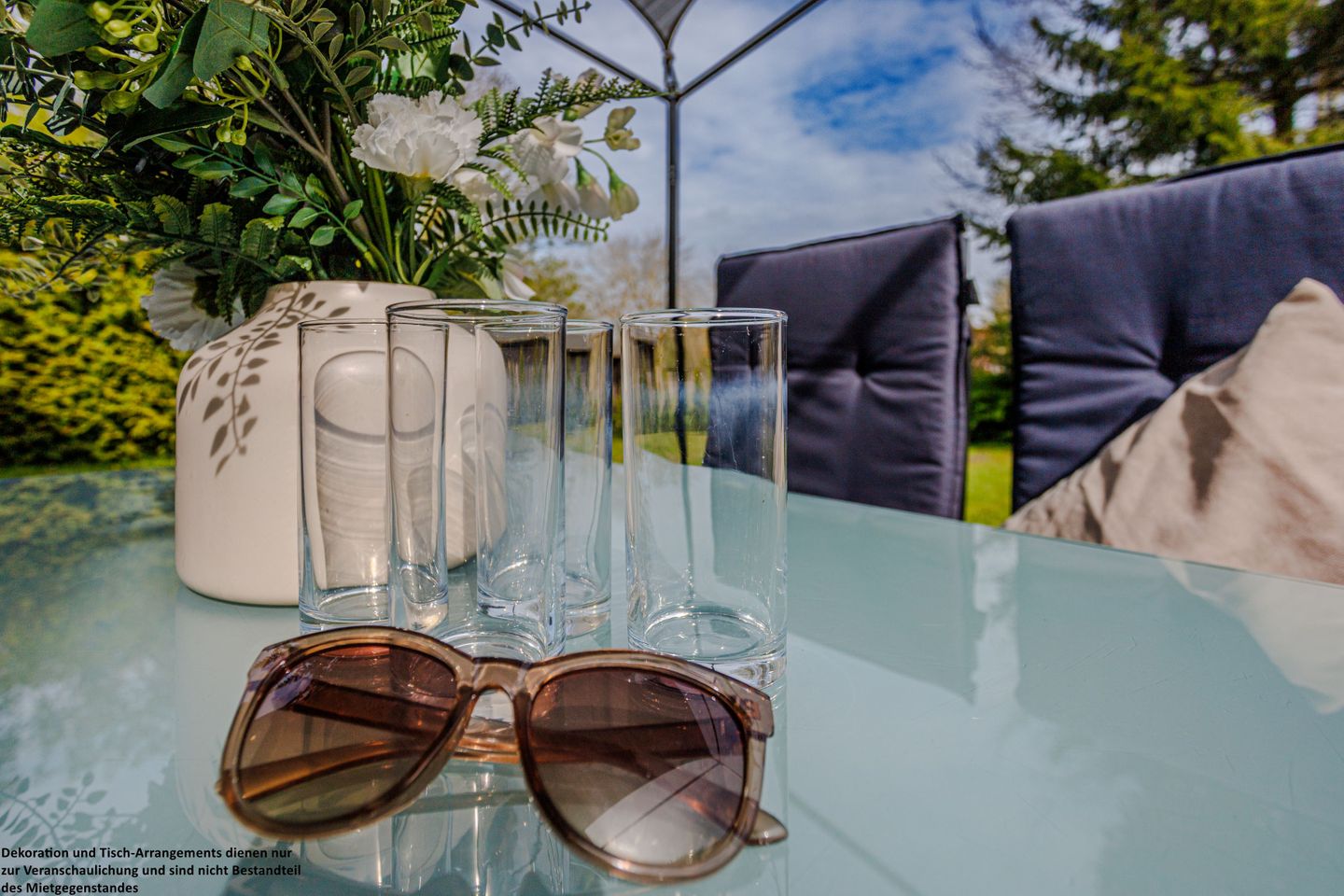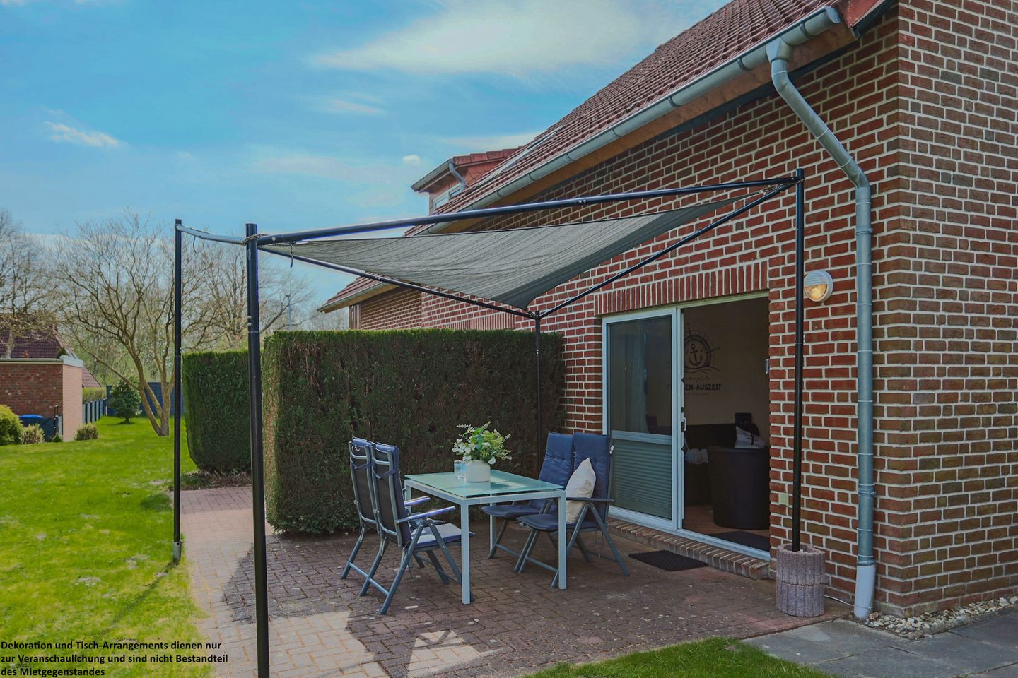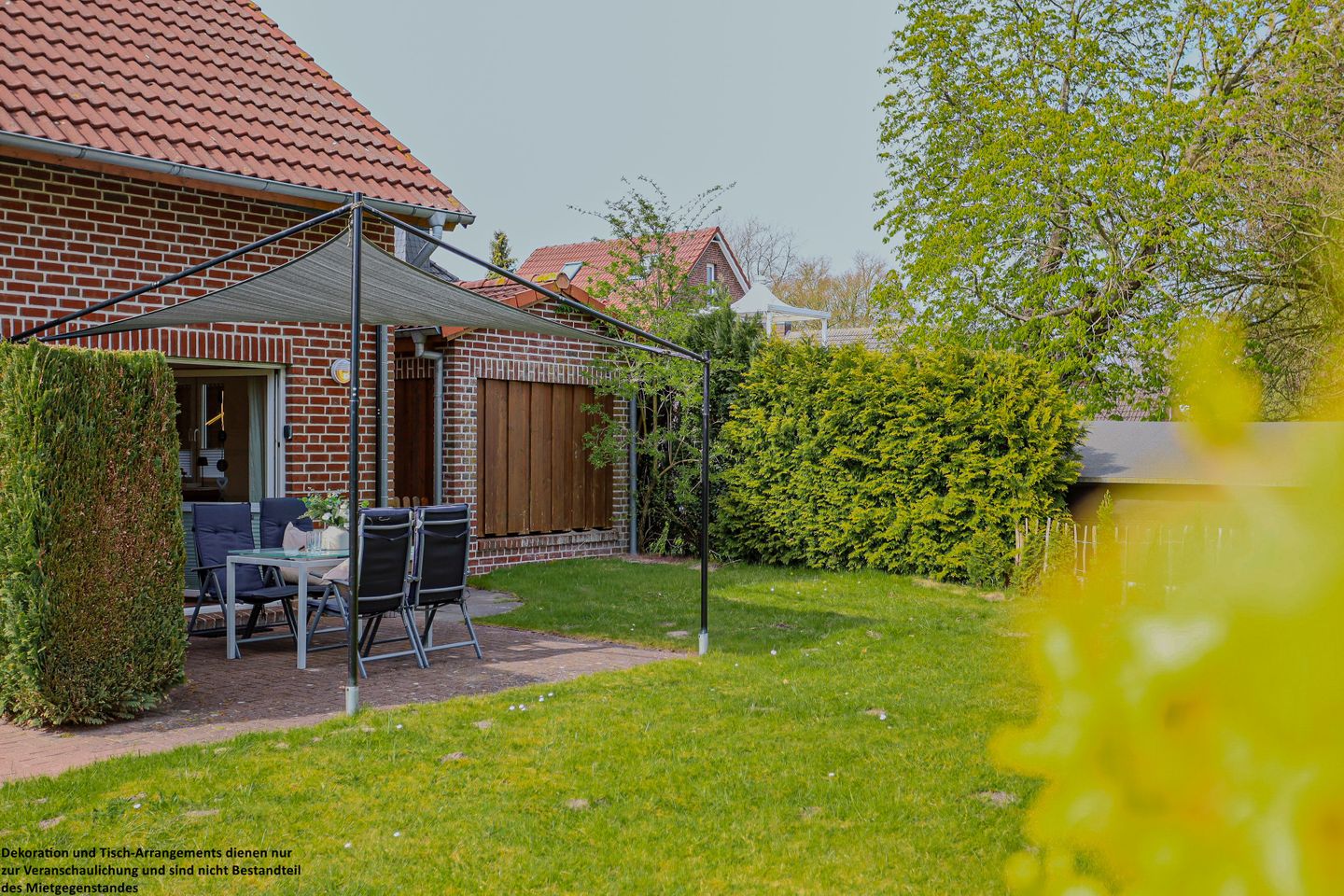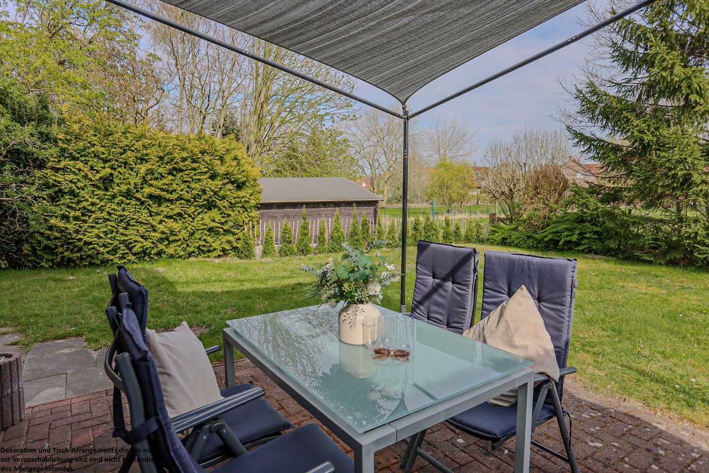 Von hier aus treten Sie hinaus auf die schöne Terrasse, wo Sie unter dem Sonnensegel entspannen und den Blick in den Garten genießen können.
