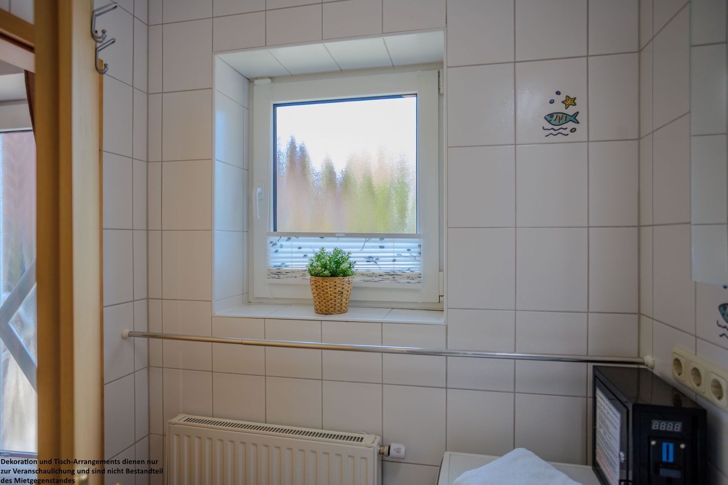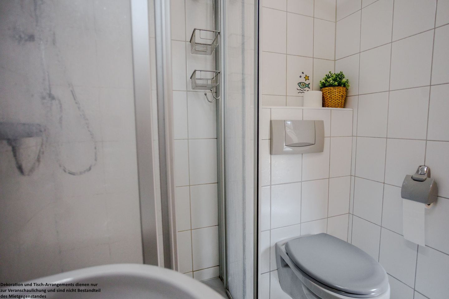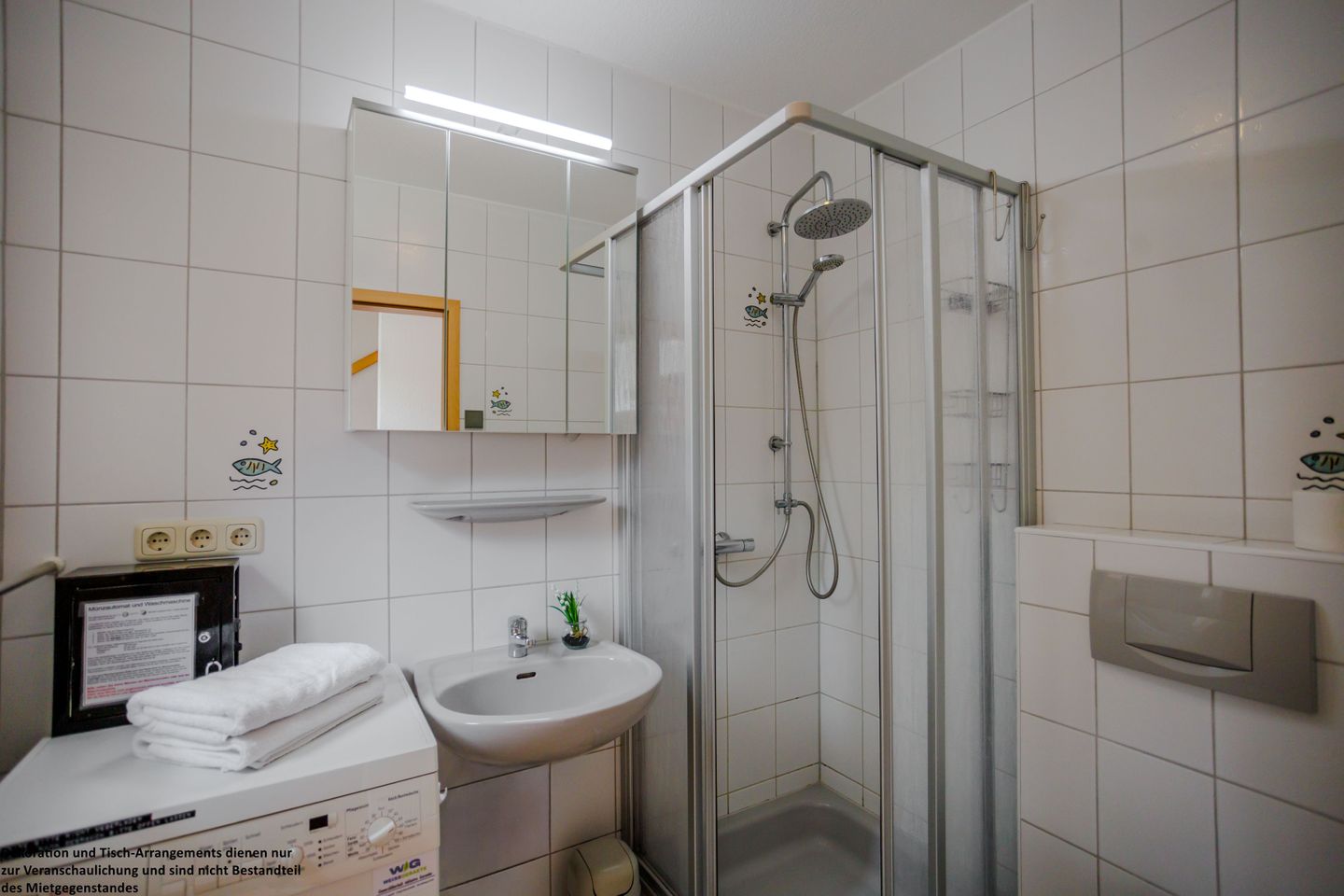 Im Erdgeschoss befindet sich zudem ein Badezimmer mit Dusche, Waschbecken und einer Waschmaschine (gegen Gebühr per Münzautomat).