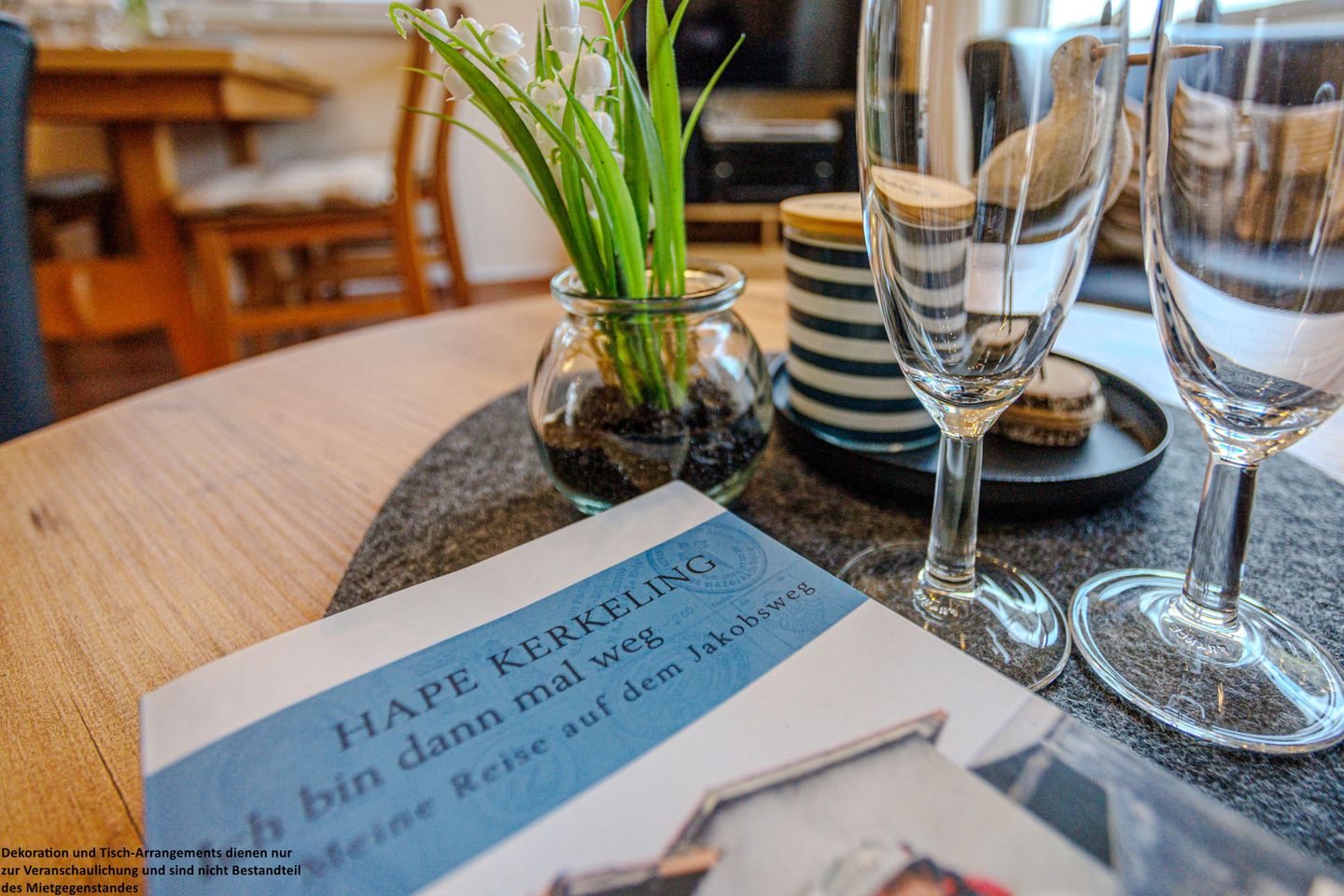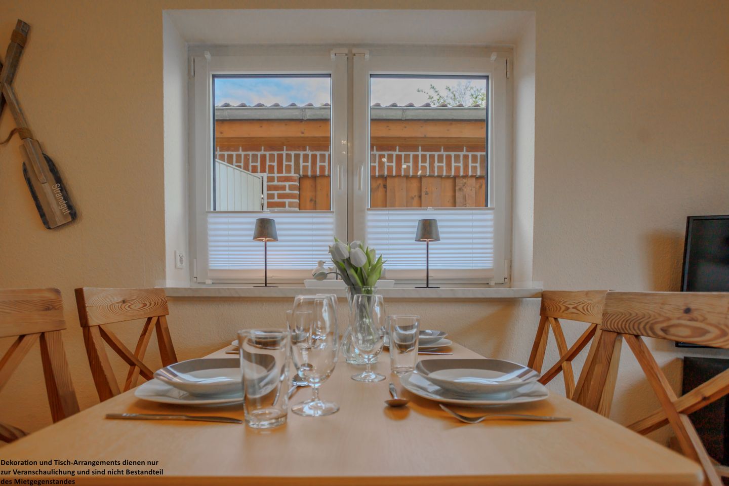 Die angrenzende Essecke bietet ausreichend Platz für gemeinsame Mahlzeiten und fröhliche Spieleabende. Bücher, Spiele und eine HiFi-Anlage stehen Ihnen dafür bereit und machen jeden Moment besonders.