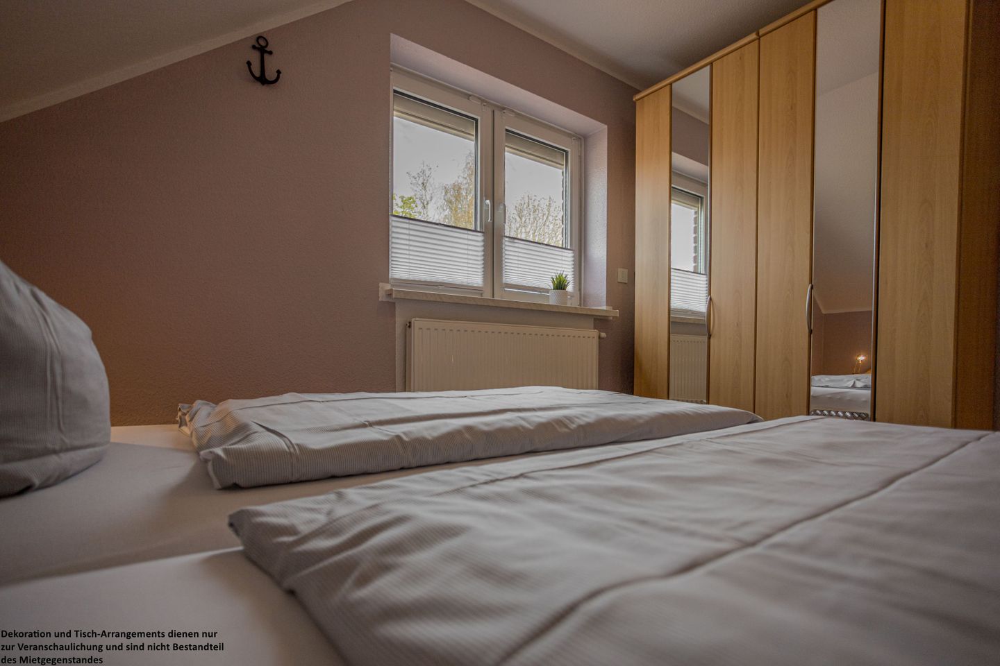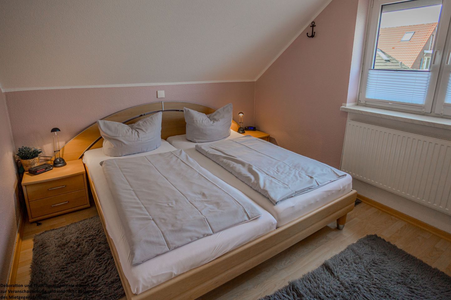 Das erste Schlafzimmer bietet ein komfortables Holzbett (180 x 200 cm) mit Einzelmatratzen, Nachttischen und einem großzügigen Kleiderschrank.