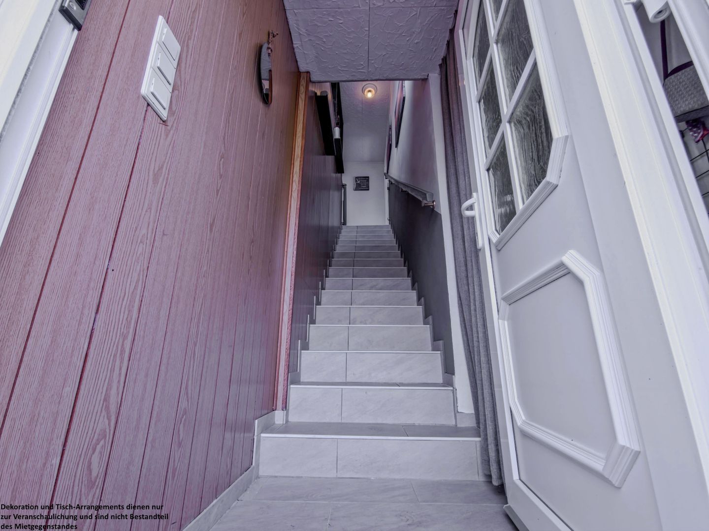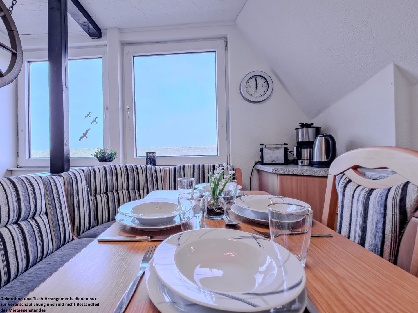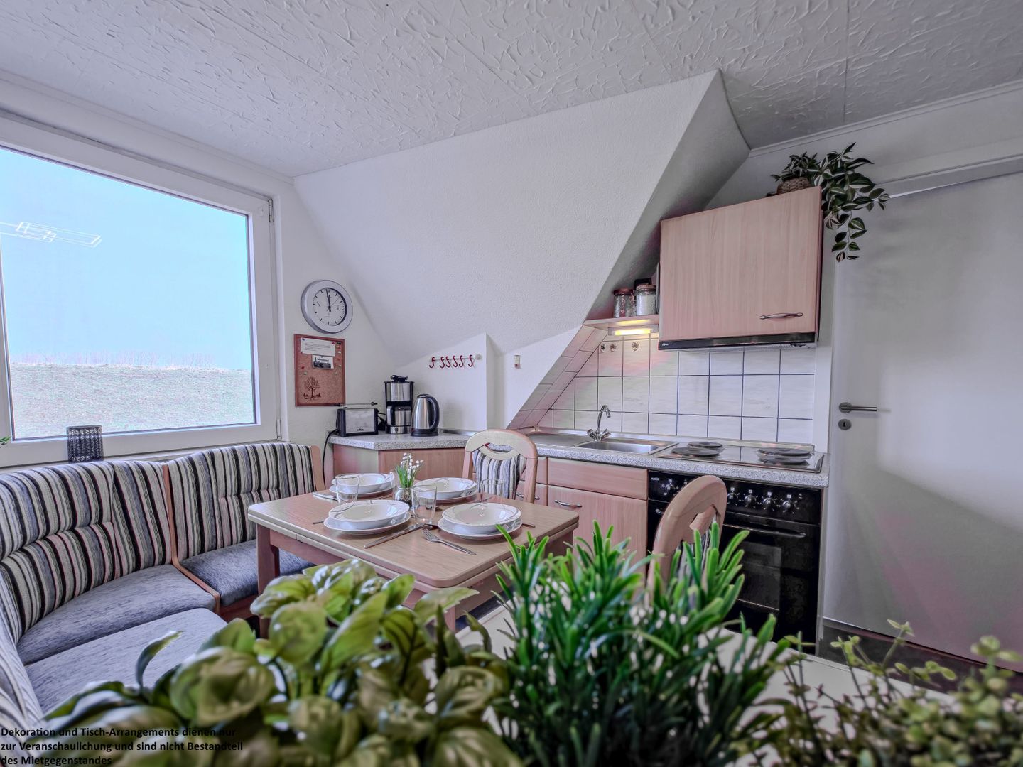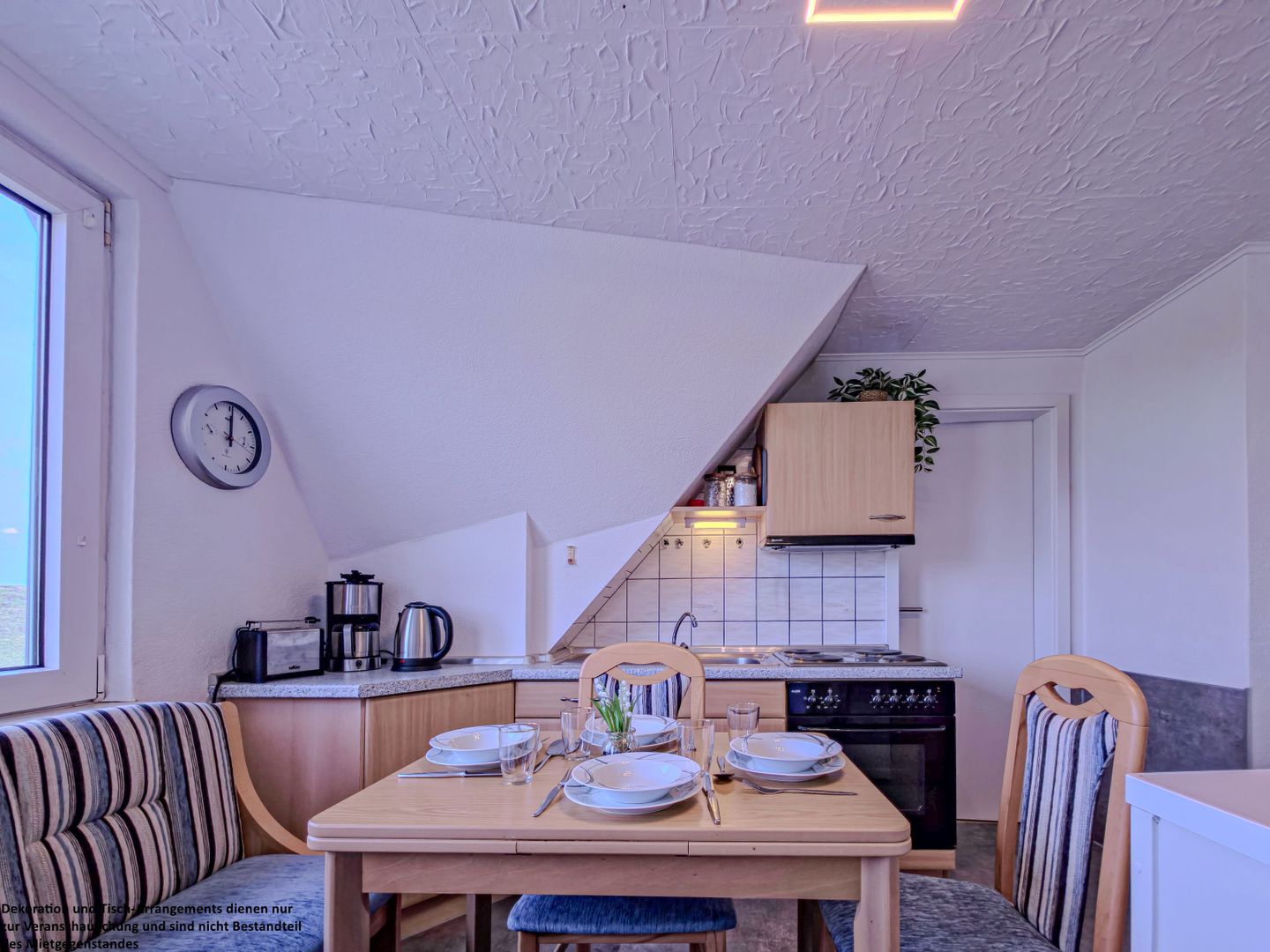 Über eine stabile Steintreppe gelangen Sie in die Ferienwohnung in der ersten Etage. Oben angekommen öffnet sich der helle Wohnbereich: Zur linken Seite erwartet Sie eine voll ausgestattete Küche, die alles bereithält, was Sie für eine entspannte Selbstversorgung benötigen. Direkt daneben lädt die gemütliche Essgruppe mit Platz für vier Personen zu gemeinsamen Mahlzeiten, Spieleabenden oder langen Gesprächen ein.