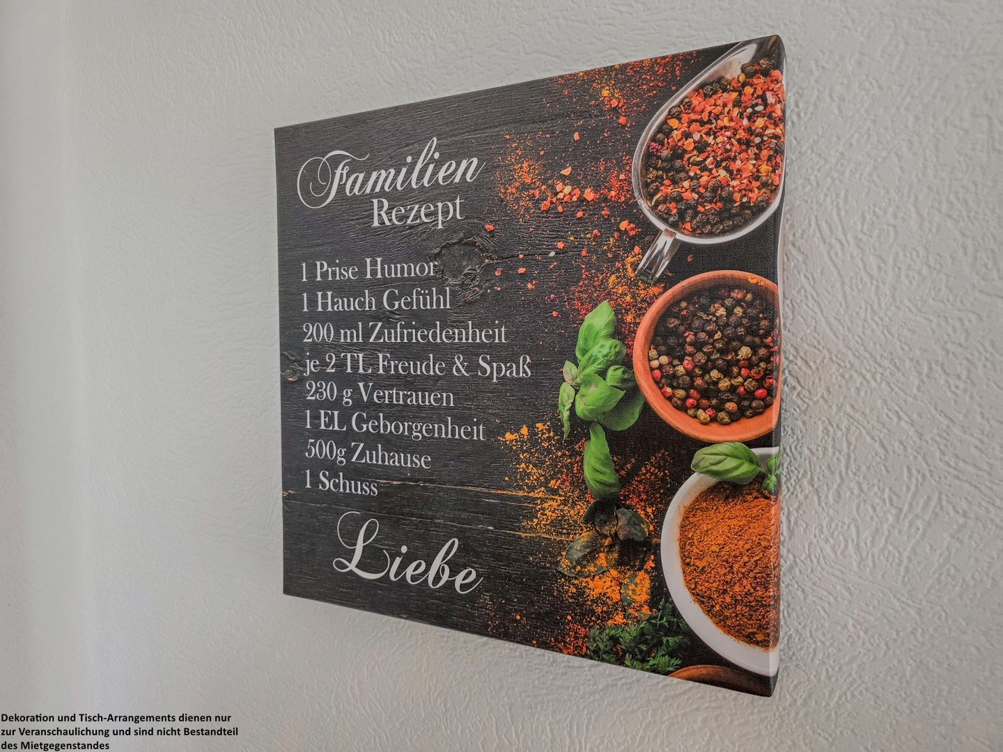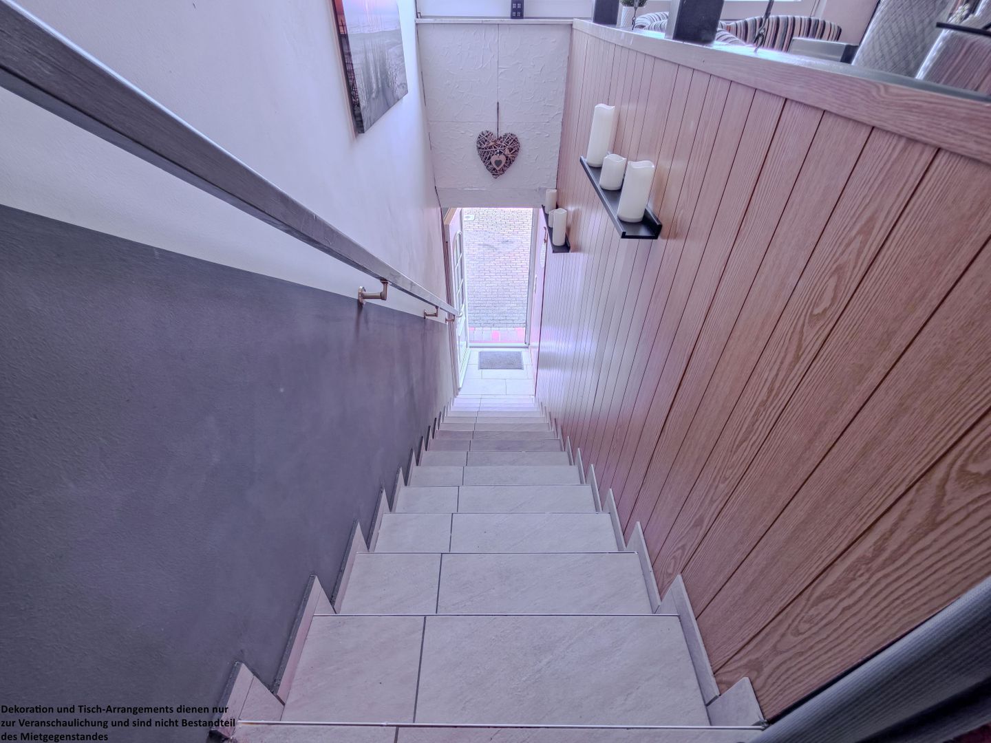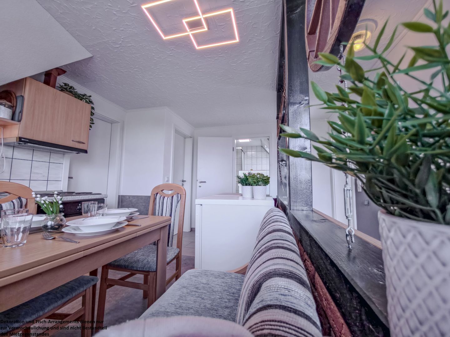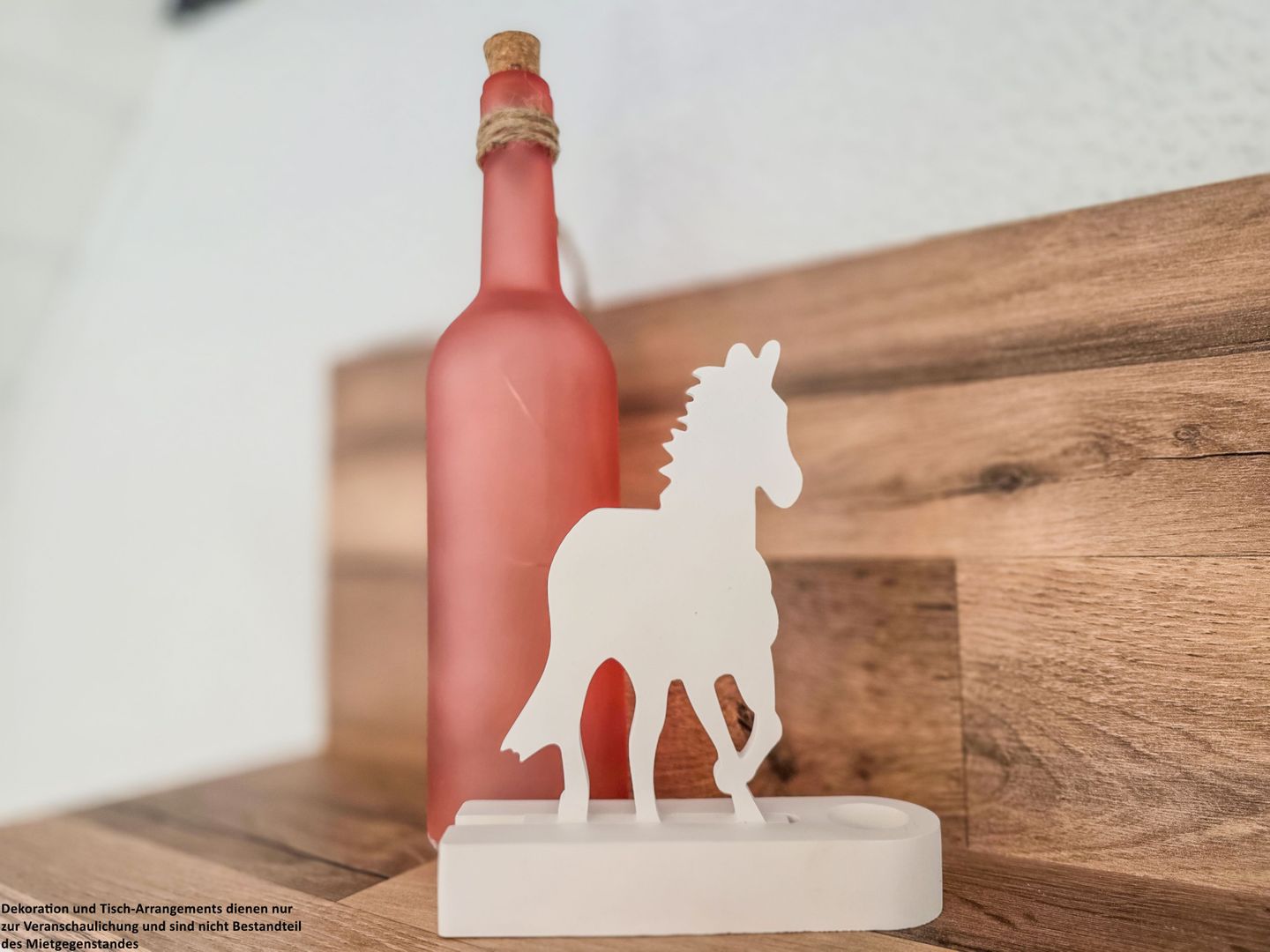 Über eine stabile Steintreppe gelangen Sie in die Ferienwohnung in der ersten Etage. Oben angekommen öffnet sich der helle Wohnbereich: Zur linken Seite erwartet Sie eine voll ausgestattete Küche, die alles bereithält, was Sie für eine entspannte Selbstversorgung benötigen. Direkt daneben lädt die gemütliche Essgruppe mit Platz für vier Personen zu gemeinsamen Mahlzeiten, Spieleabenden oder langen Gesprächen ein.