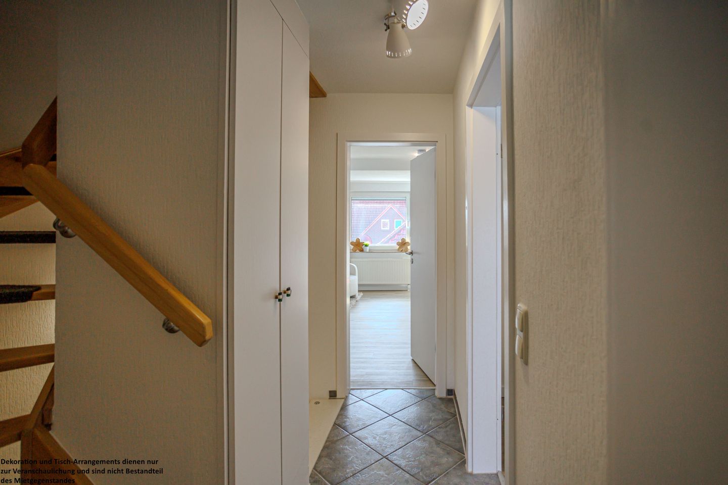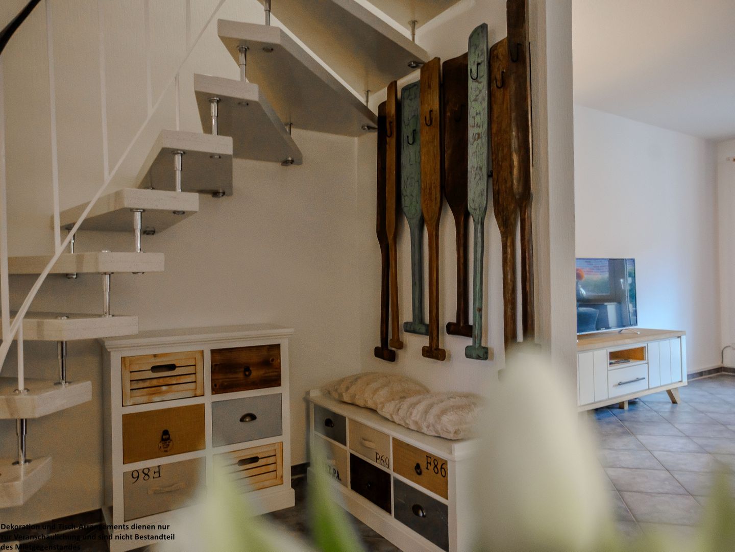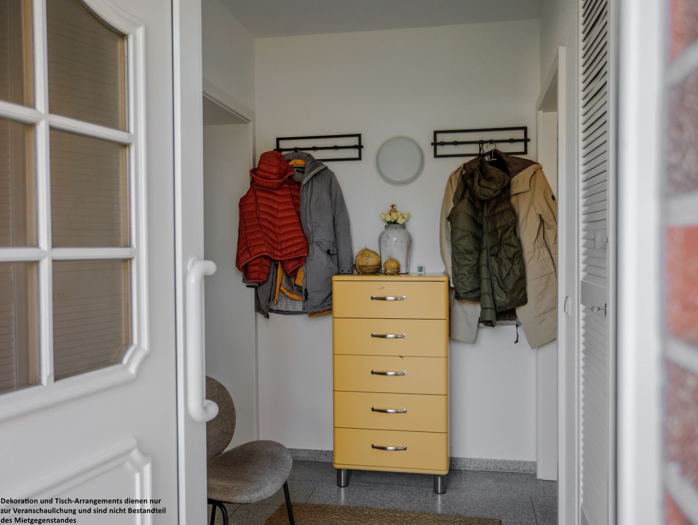 Schon beim Eintreten empfängt Sie der freundliche Eingangsbereich mit einer modernen Kommode und einer Garderobe, die Platz für Ihre Ankunft und Ihre ersten Urlaubsmomente schafft.
