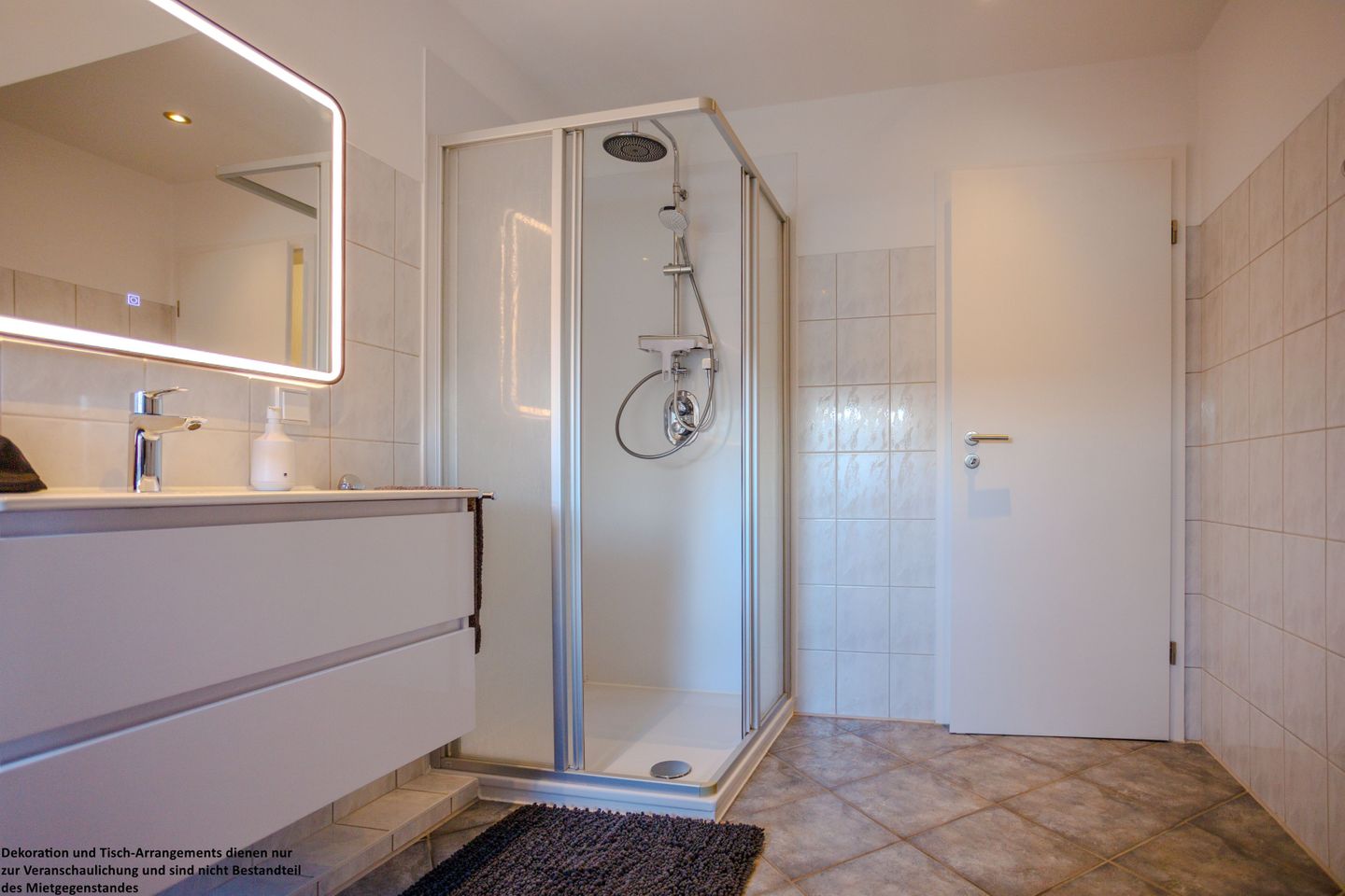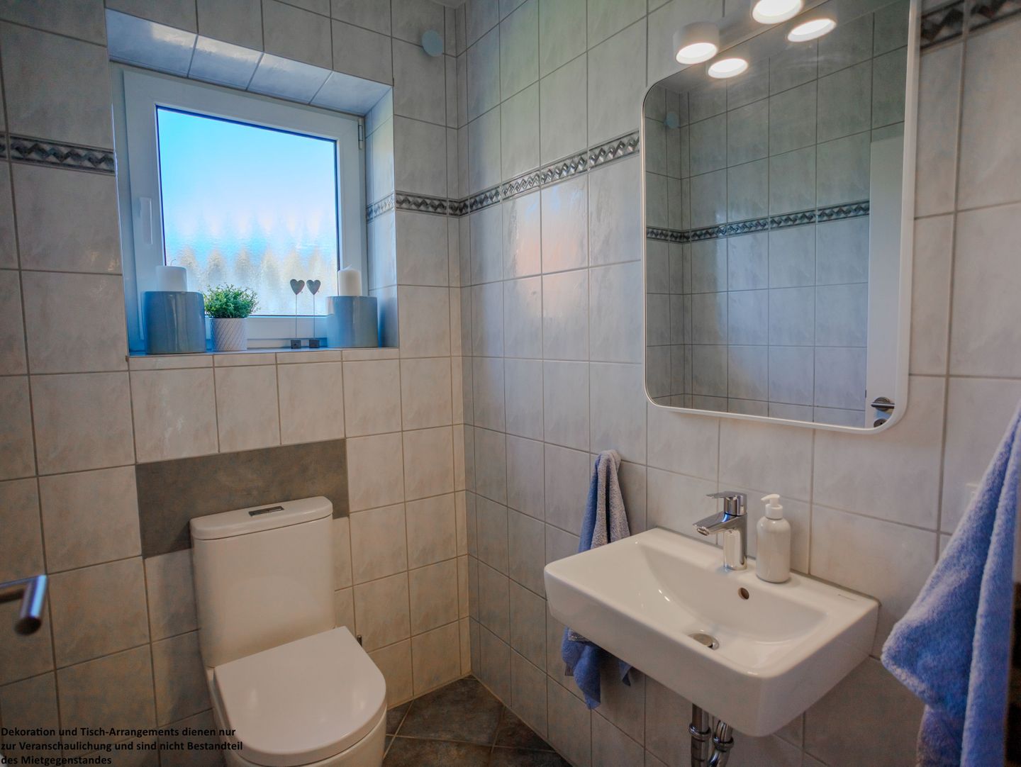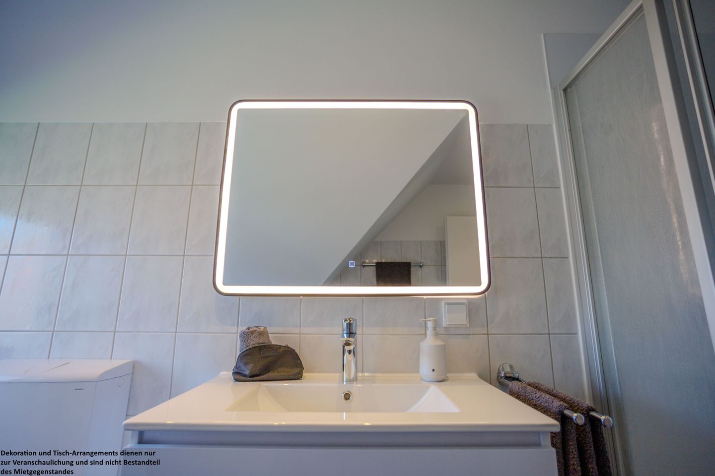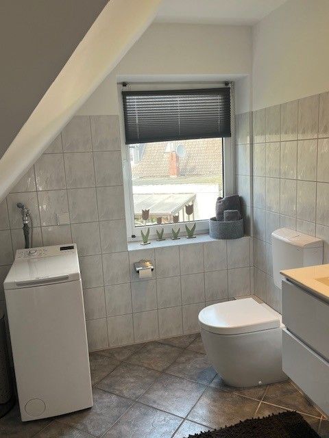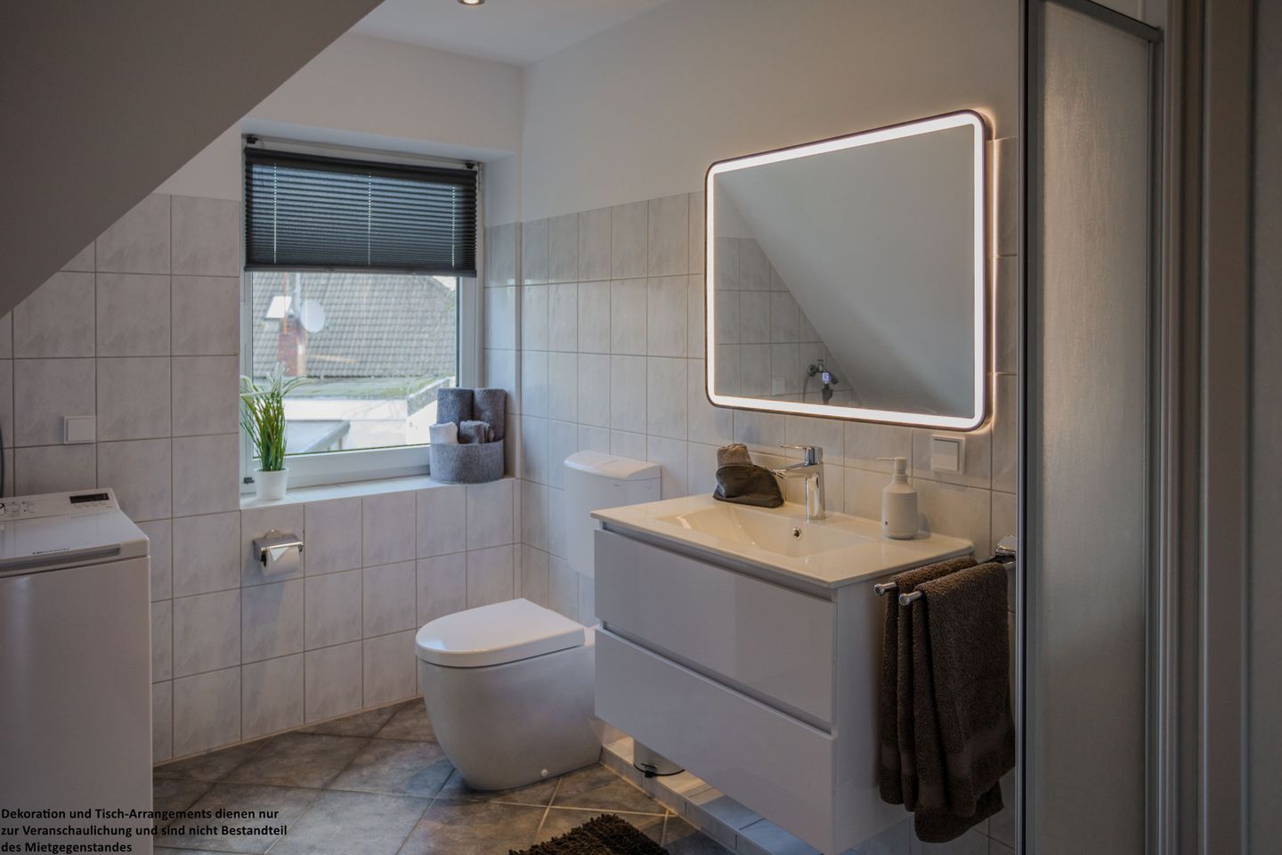 Das helle Badezimmer im Obergeschoss ist modern gefliest und mit einem großen, beleuchteten Spiegel ausgestattet. Dank Tageslicht wirkt es freundlich und einladend. Eine Waschmaschine sorgt zusätzlich für praktischen Komfort während Ihres Aufenthalts.