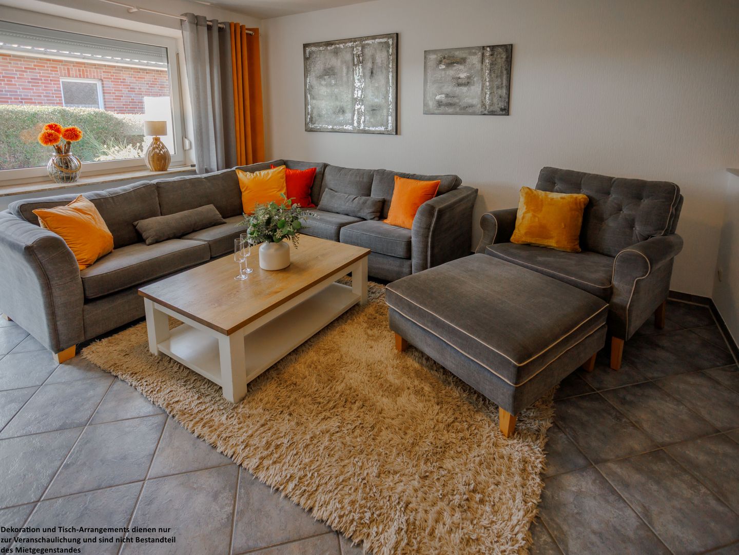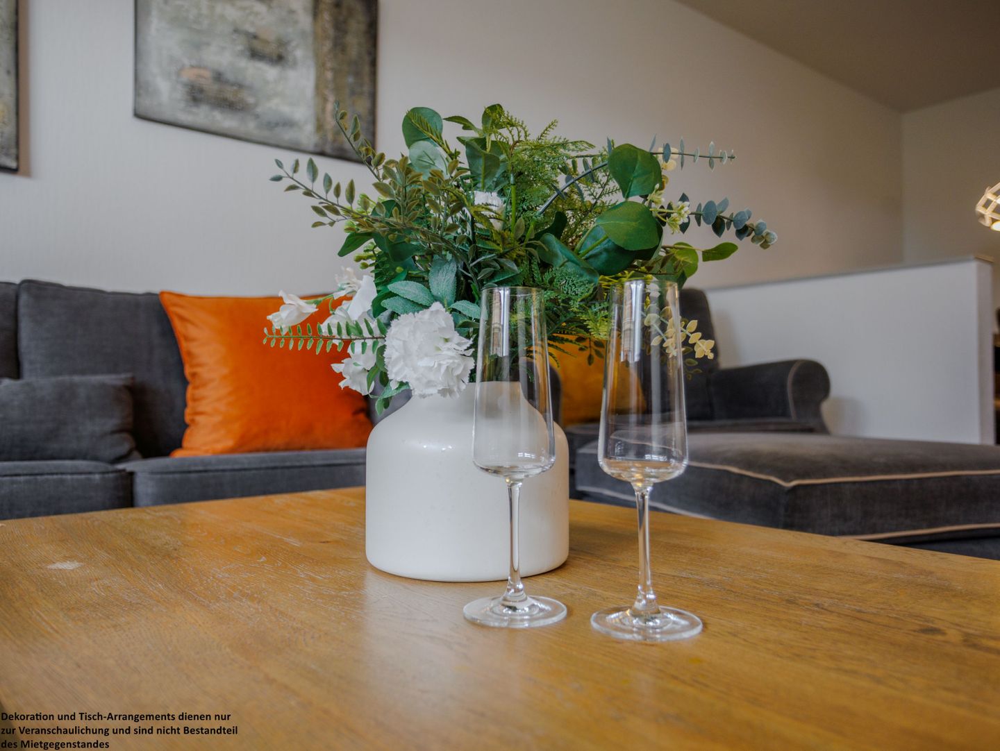 Vom Flur aus öffnet sich das Herz des Hauses: das großzügige, stilvoll eingerichtete Wohnzimmer. Große Fenster lassen den Raum in warmem Tageslicht erstrahlen und holen die Sonne schon am Morgen ins Haus.
