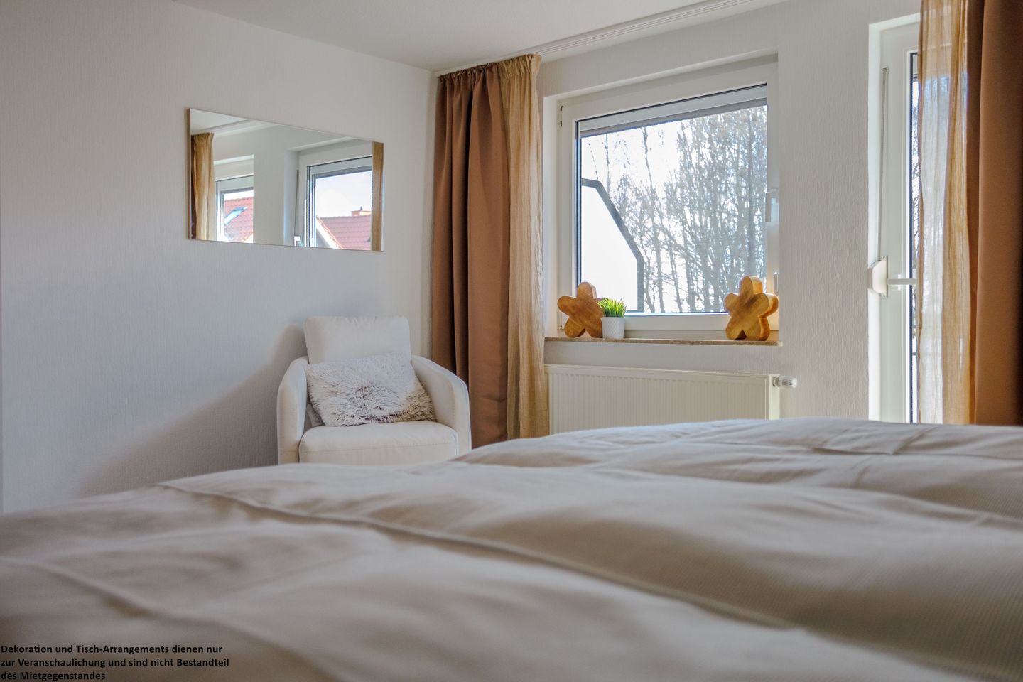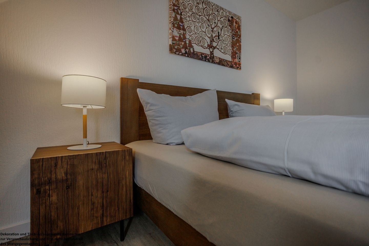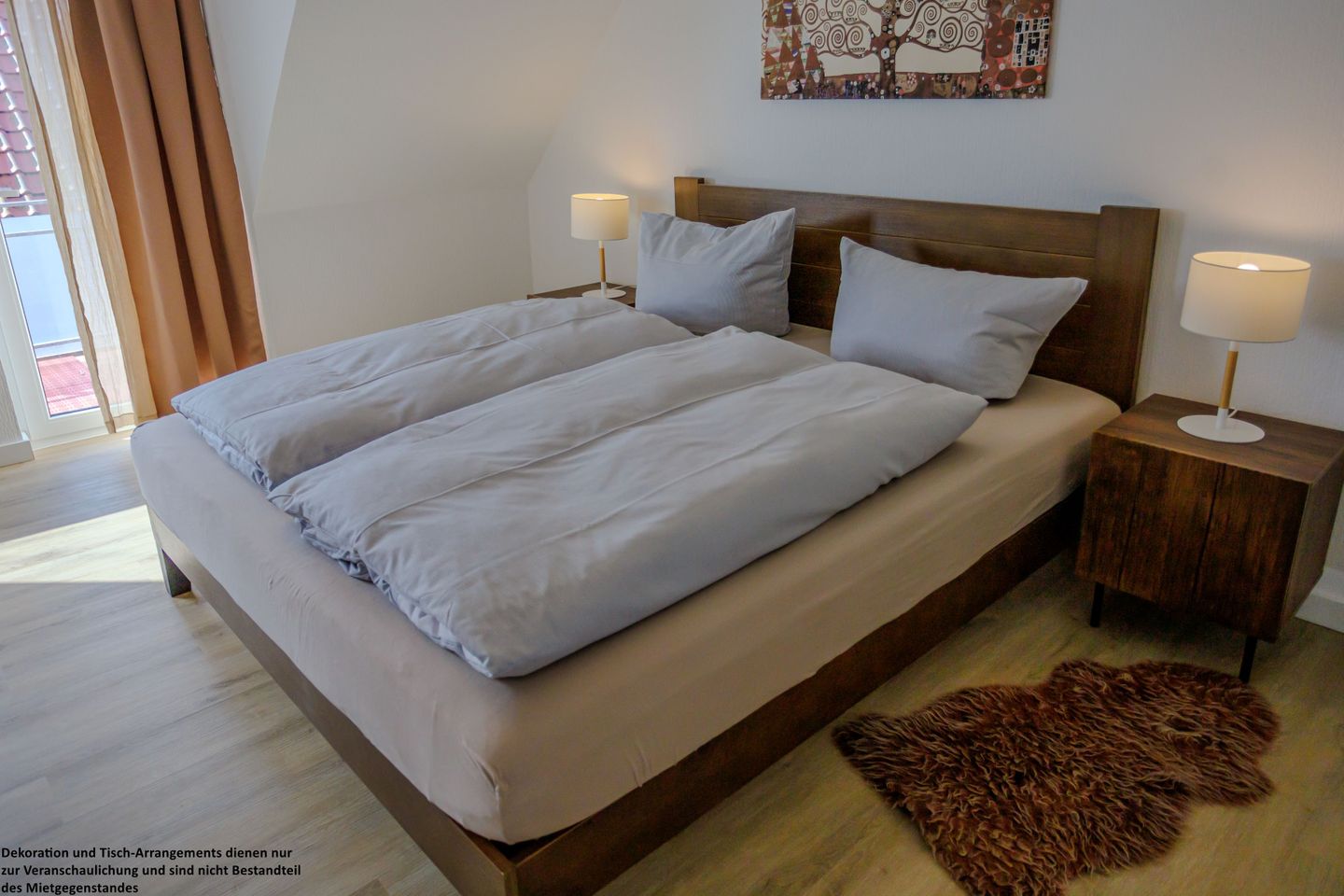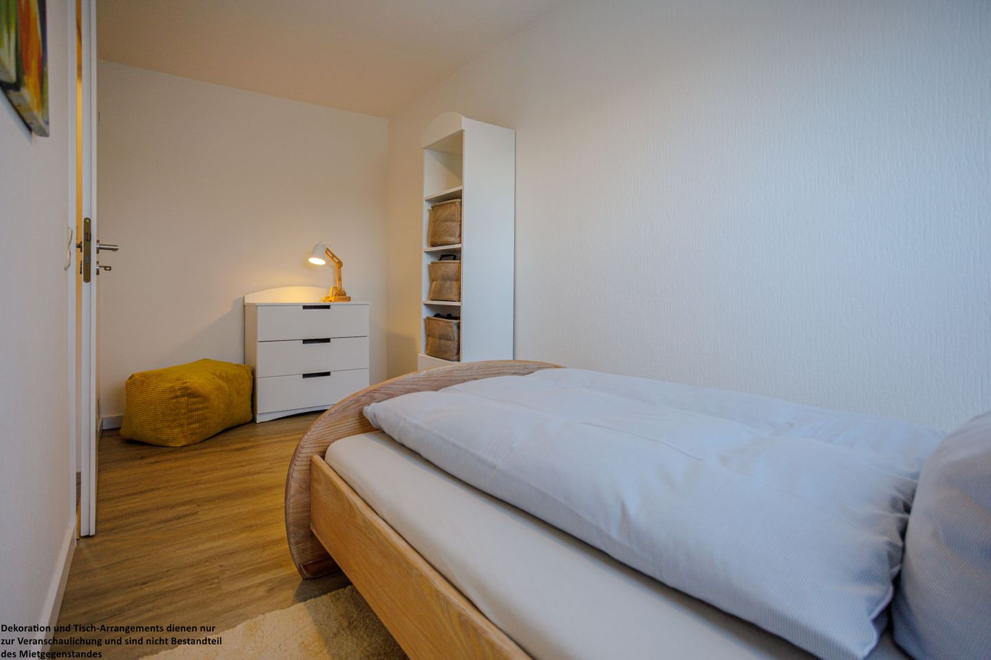 Das erste Schlafzimmer überzeugt mit einem gemütlichen 180x200 cm Holzbett (durchgehende Matratze) und warmen Naturtönen, die eine besonders behagliche Atmosphäre schaffen. Ein Kleiderschrank bietet ausreichend Stauraum und vom Zimmer aus gelangen Sie direkt auf den Balkon – ein wunderbarer Ort, um die Abendsonne zu genießen.