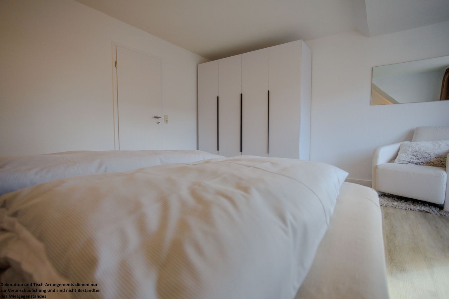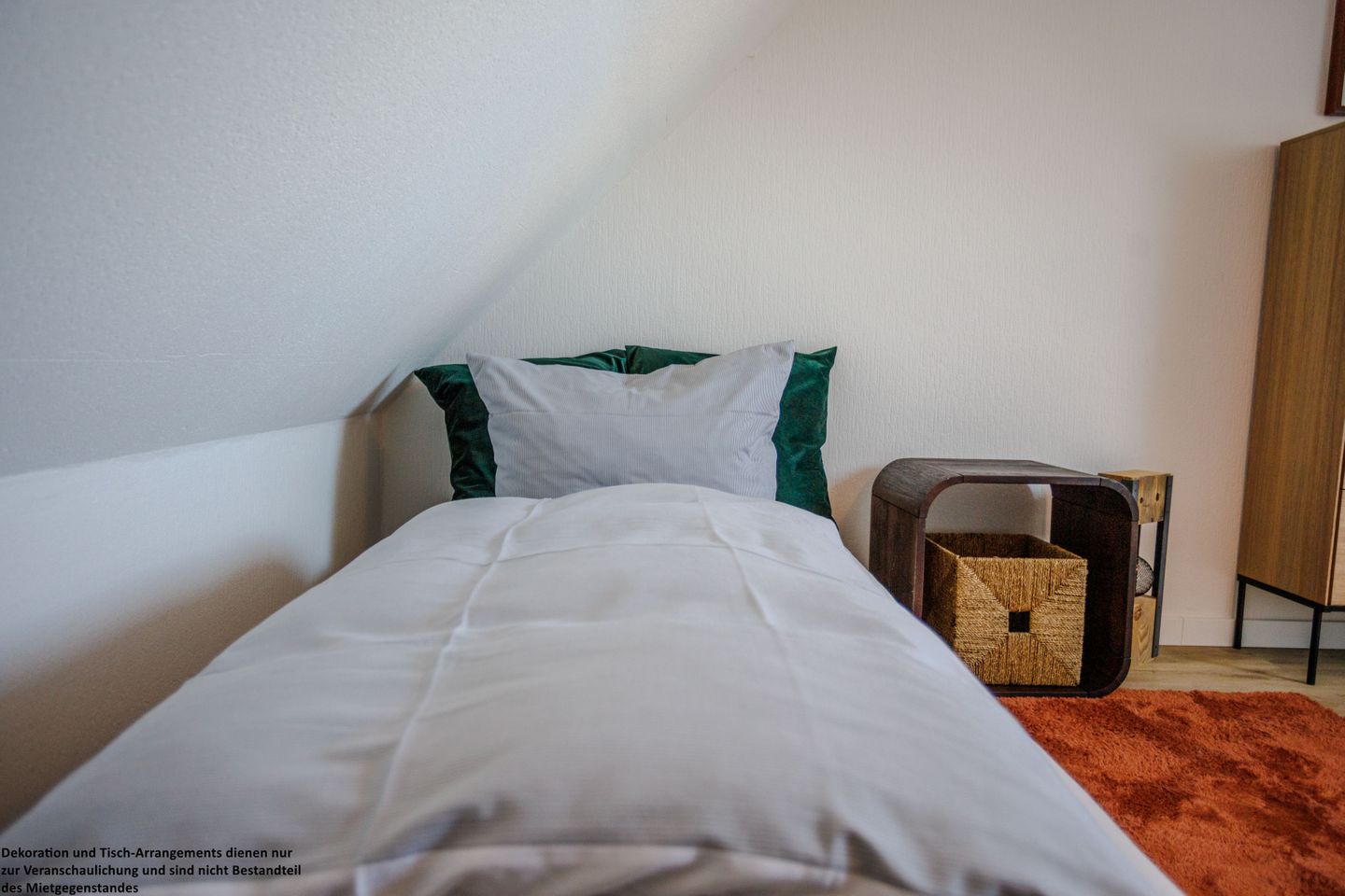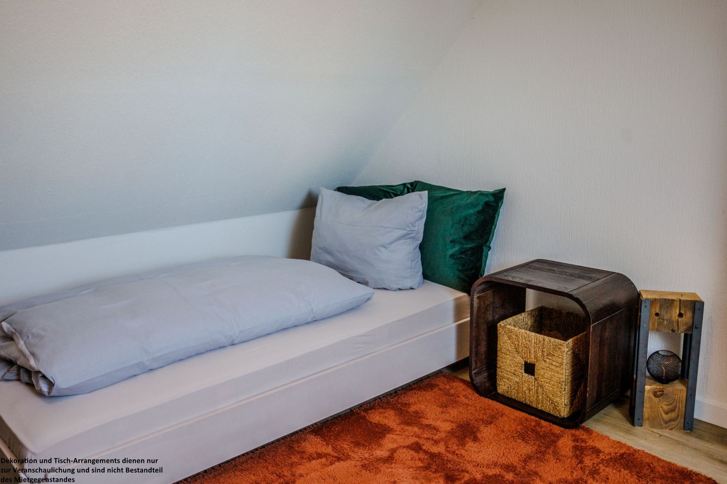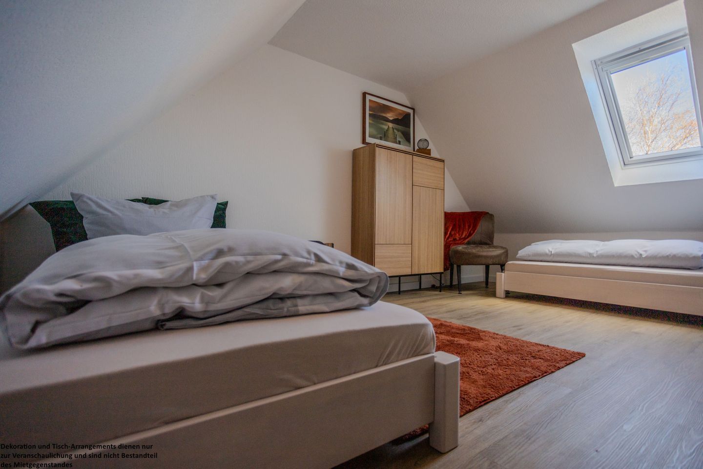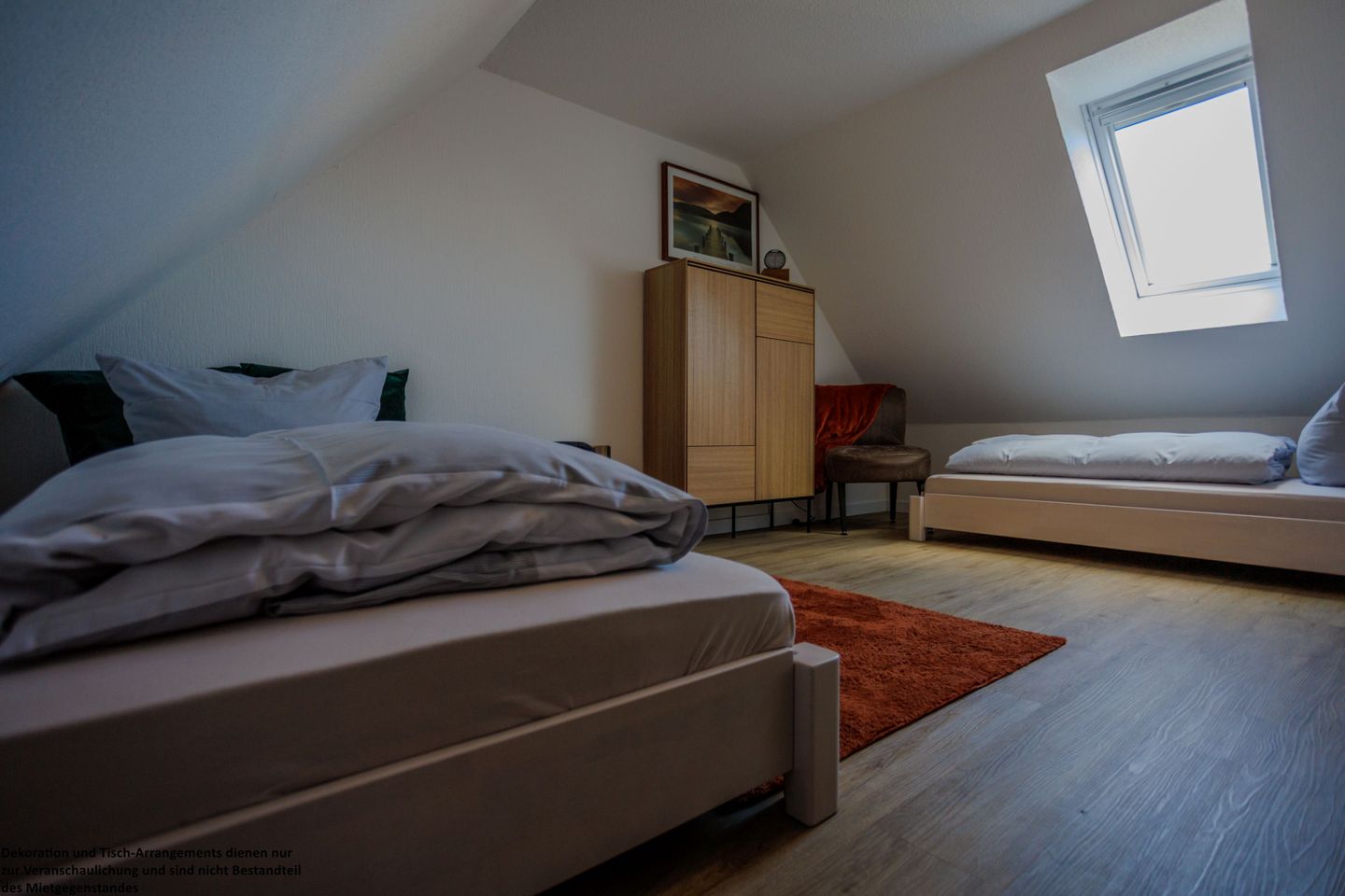 Im Dachgeschoss erwartet Sie ein weiterer gemütlicher Schlafraum mit zwei Einzelbetten – ideal für Kinder oder zusätzliche Gäste. Auch hier stehen Ihnen praktische Stauraummöglichkeiten zur Verfügung.