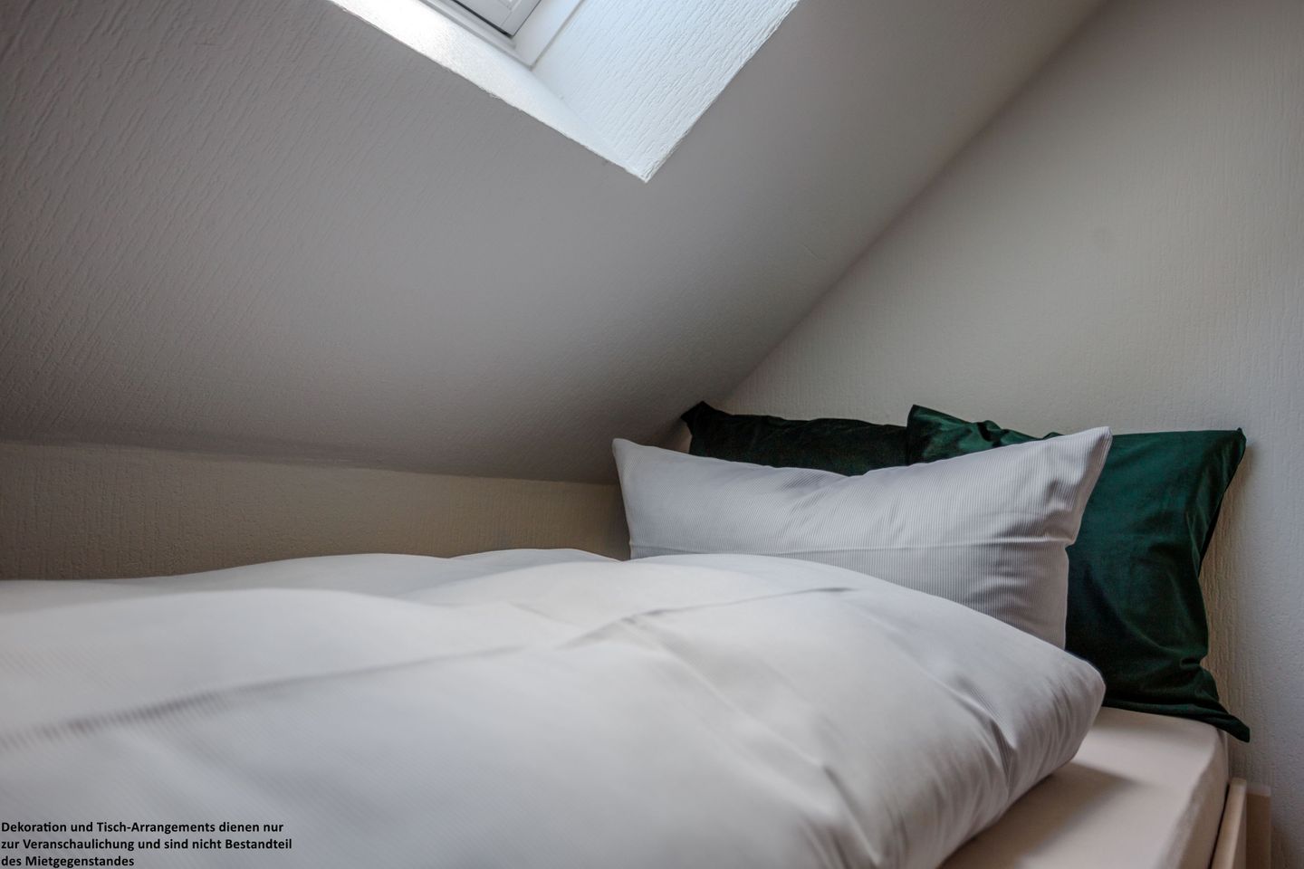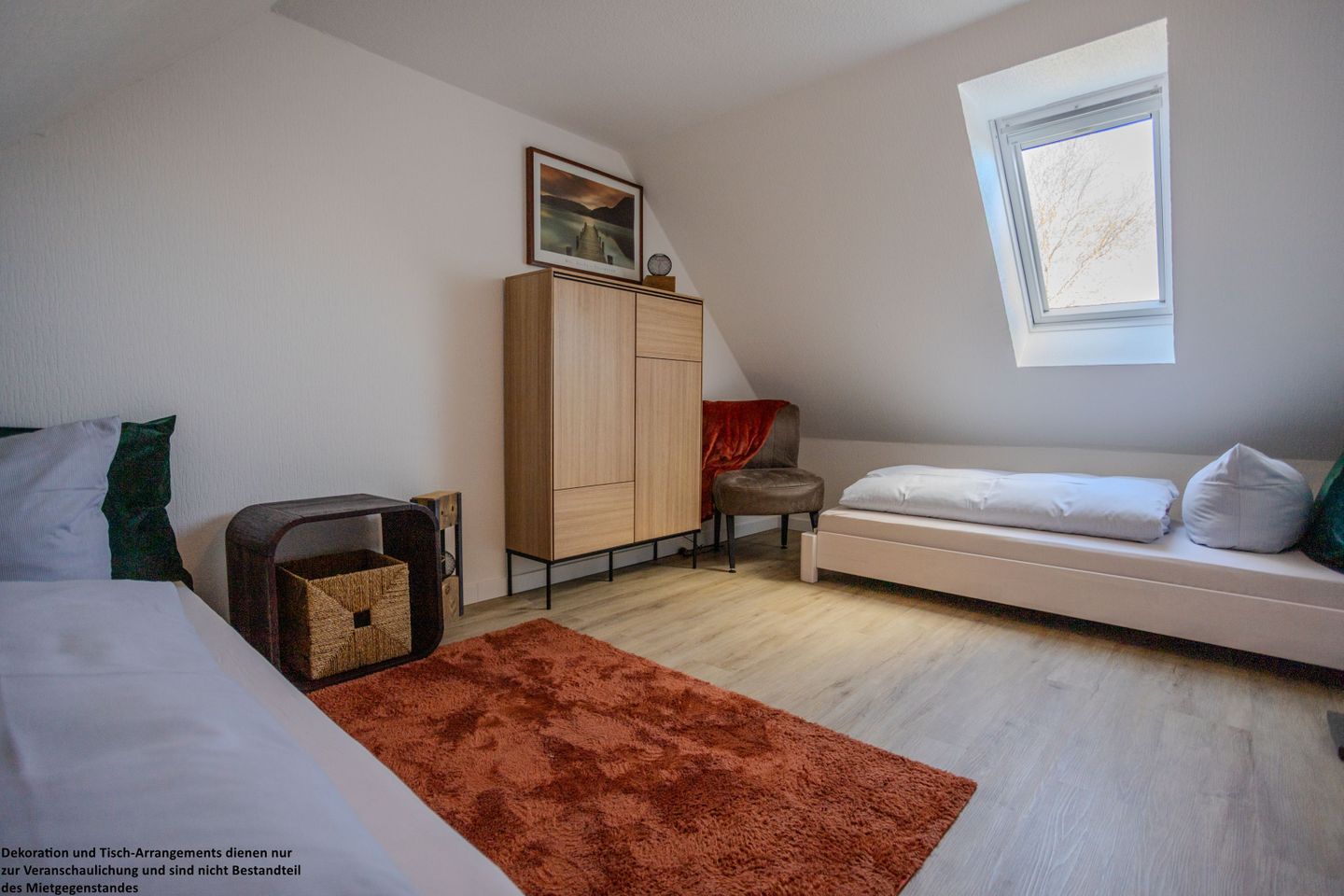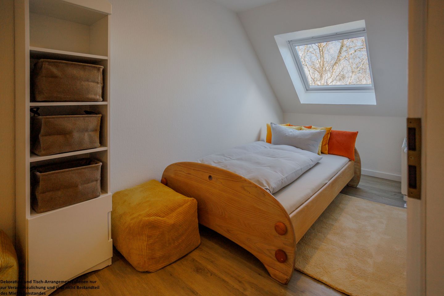 Das zweite Schlafzimmer verfügt über ein 140x200 cm Holzbett sowie eine Kommode und praktische Aufbewahrungsmöglichkeiten. Ein großes Dachfenster eröffnet Ihnen den Blick ins Grüne und lässt viel Licht und Ruhe in den Raum.
