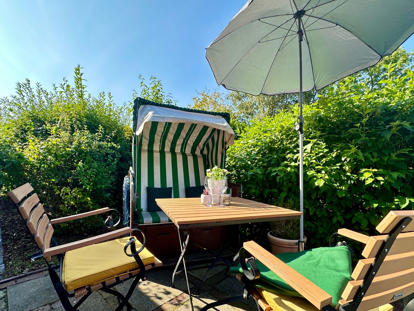 Das absolute Highlight dieses Apartments ist jedoch die traumhaft gelegene Terrasse. Hier können Sie in einem gemütlichen Strandkorb entspannen und die frische Luft der weiten Natur genießen. Ob ein Frühstück unter freiem Himmel oder ein Glas Wein am Abend – die Terrasse ist der perfekte Ort, um die Seele baumeln zu lassen und in die umliegende grüne Landschaft einzutauchen. Die sanften Farben der Natur und die Ruhe, die diesen Ort umgibt, machen jeden Moment zu einem unvergesslichen Erlebnis.